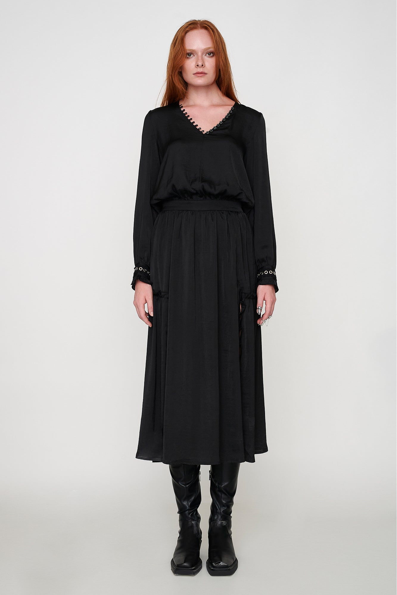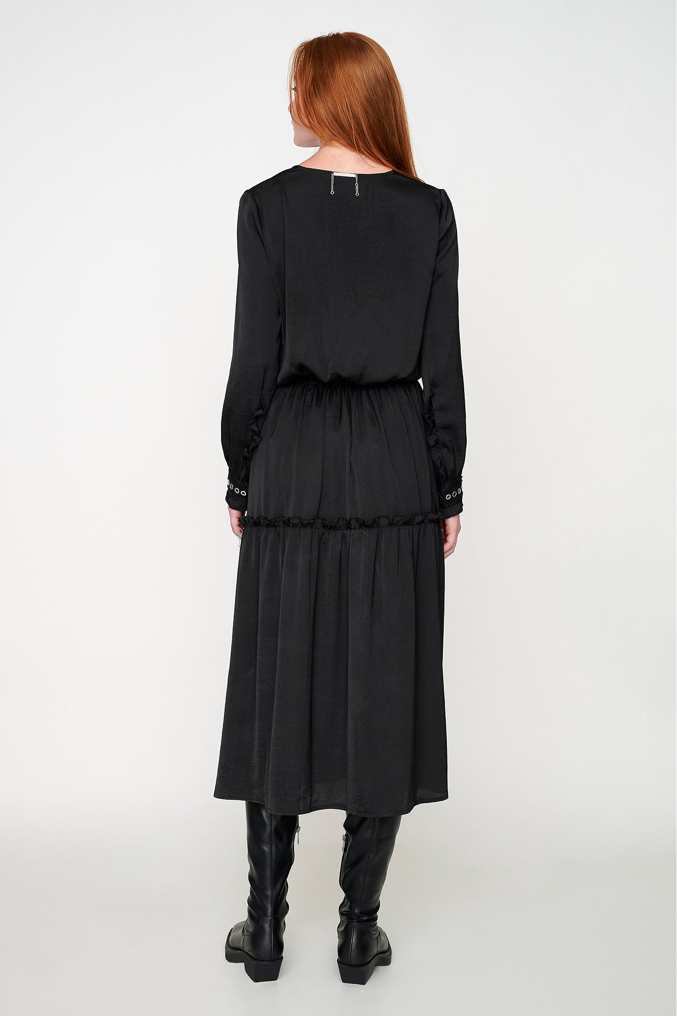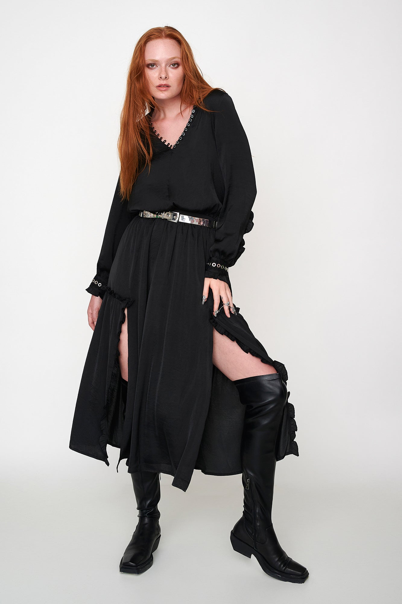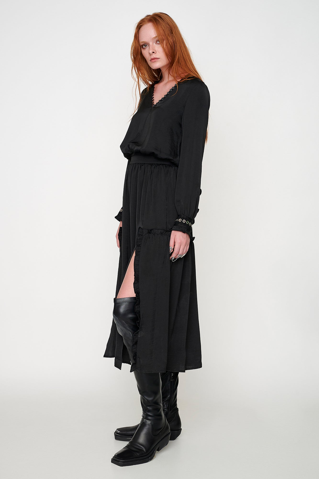 Το Leilani. Αυτό το μακρυμάνικο μάξι φόρεμα με την ελαστική μέση διαθέτει βαθιά λαιμόκοψη V με διακοσμητικά κουμπιά & θηλιά, φούστα με βολάν και άνοιγμα στο πλάι και διακοσμητική δαντέλα γύρω από τις μανσέτες στα μανίκια. Κατασκευασμένο από Ιαπωνικό σατέν ύφασμα με μεταξένιο πλύσιμο. Διαχρονικό με μοντέρνα αίσθηση, μπορεί να συνδυαστεί με κομψές γόβες ή μπότες και να δημιουργήσετε αναρίθμητα στυλ.