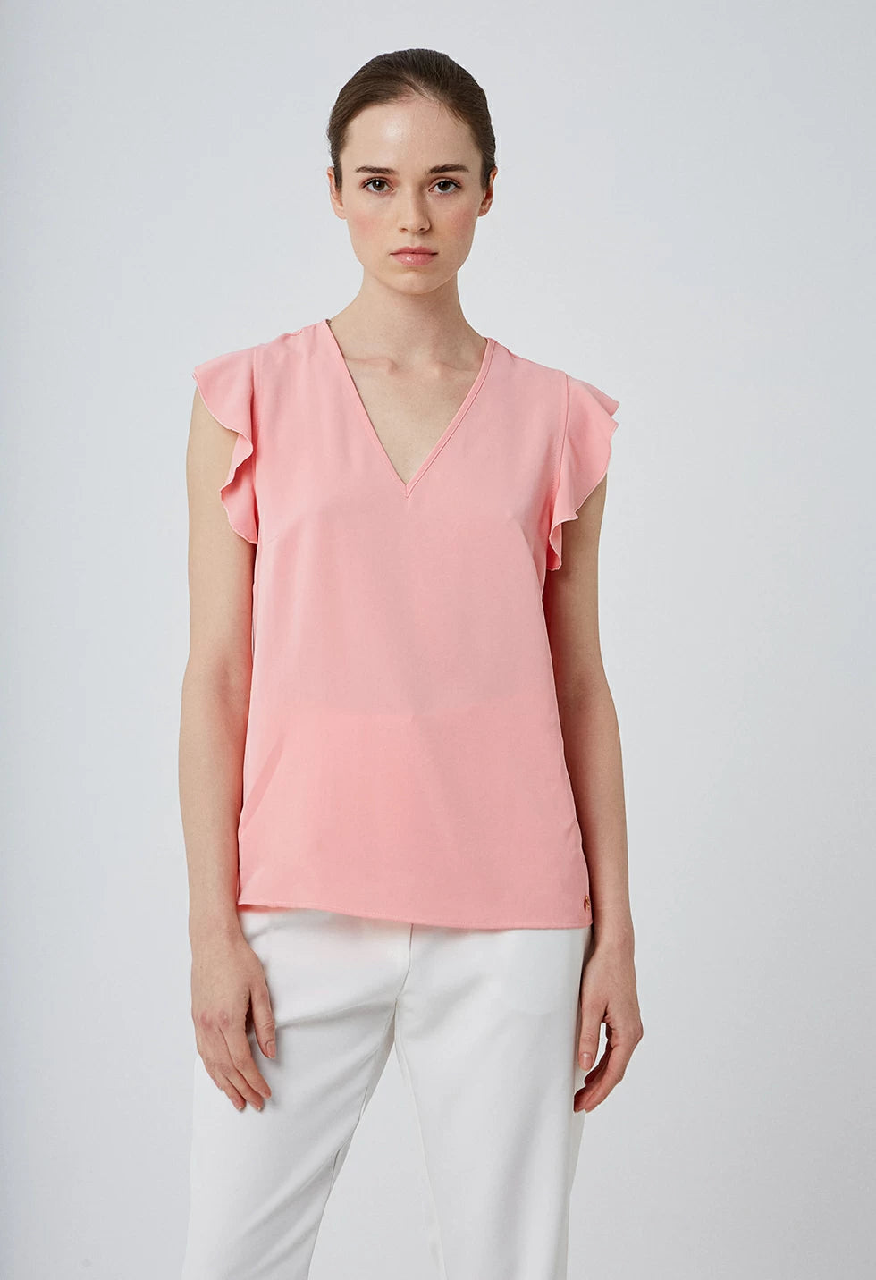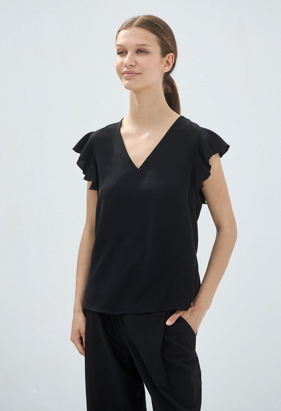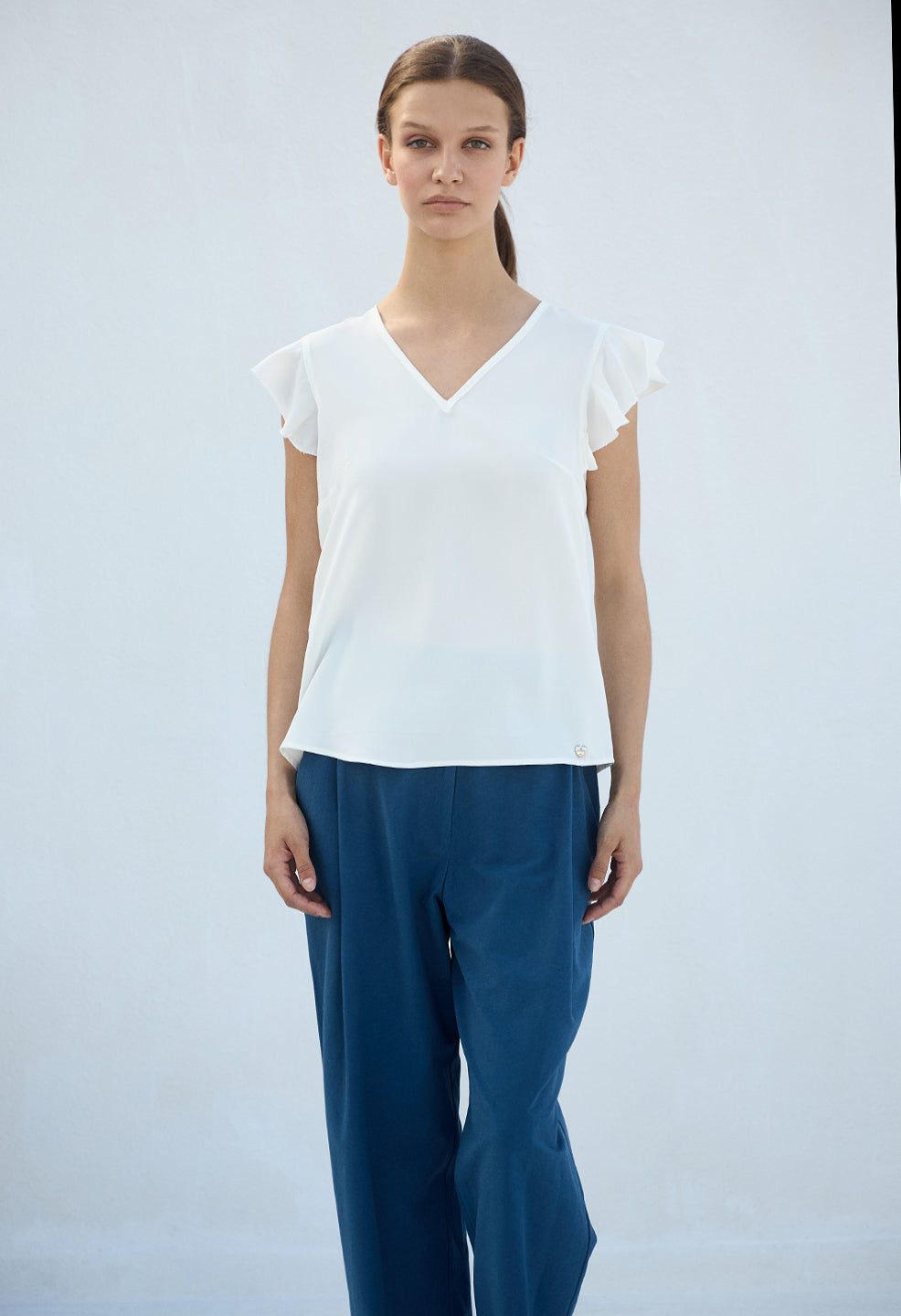 Μονόχρωμη μπλούζα με V ντεκολτέ, λεπτομέρεια βολάν στους ώμους, κανονική εφαρμογή.