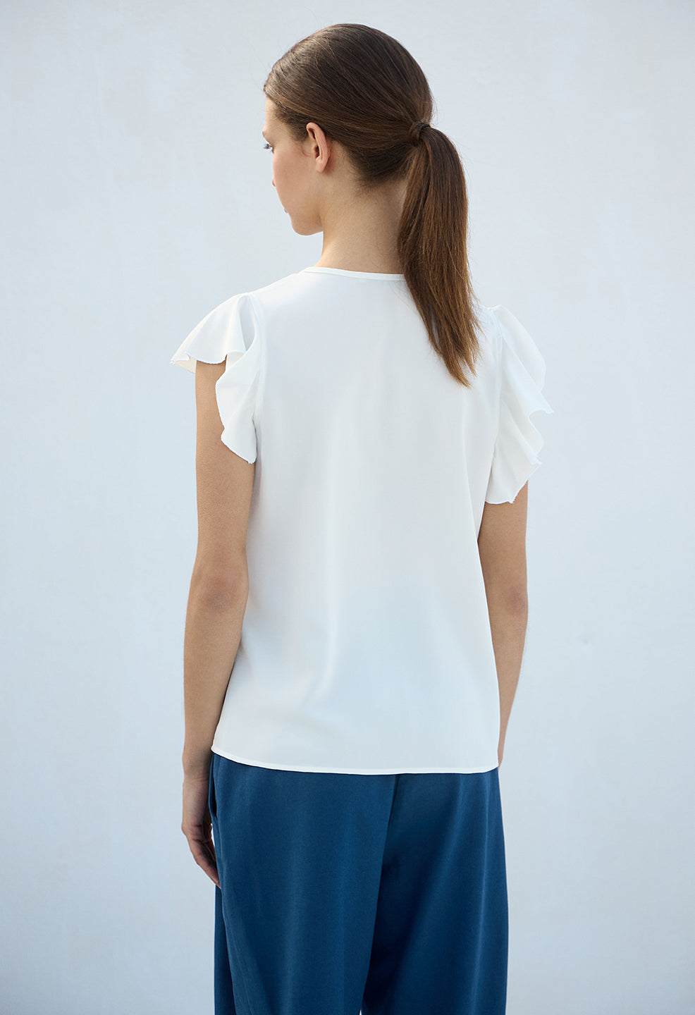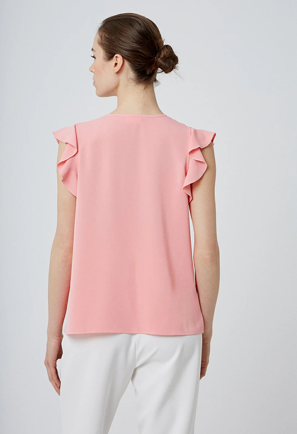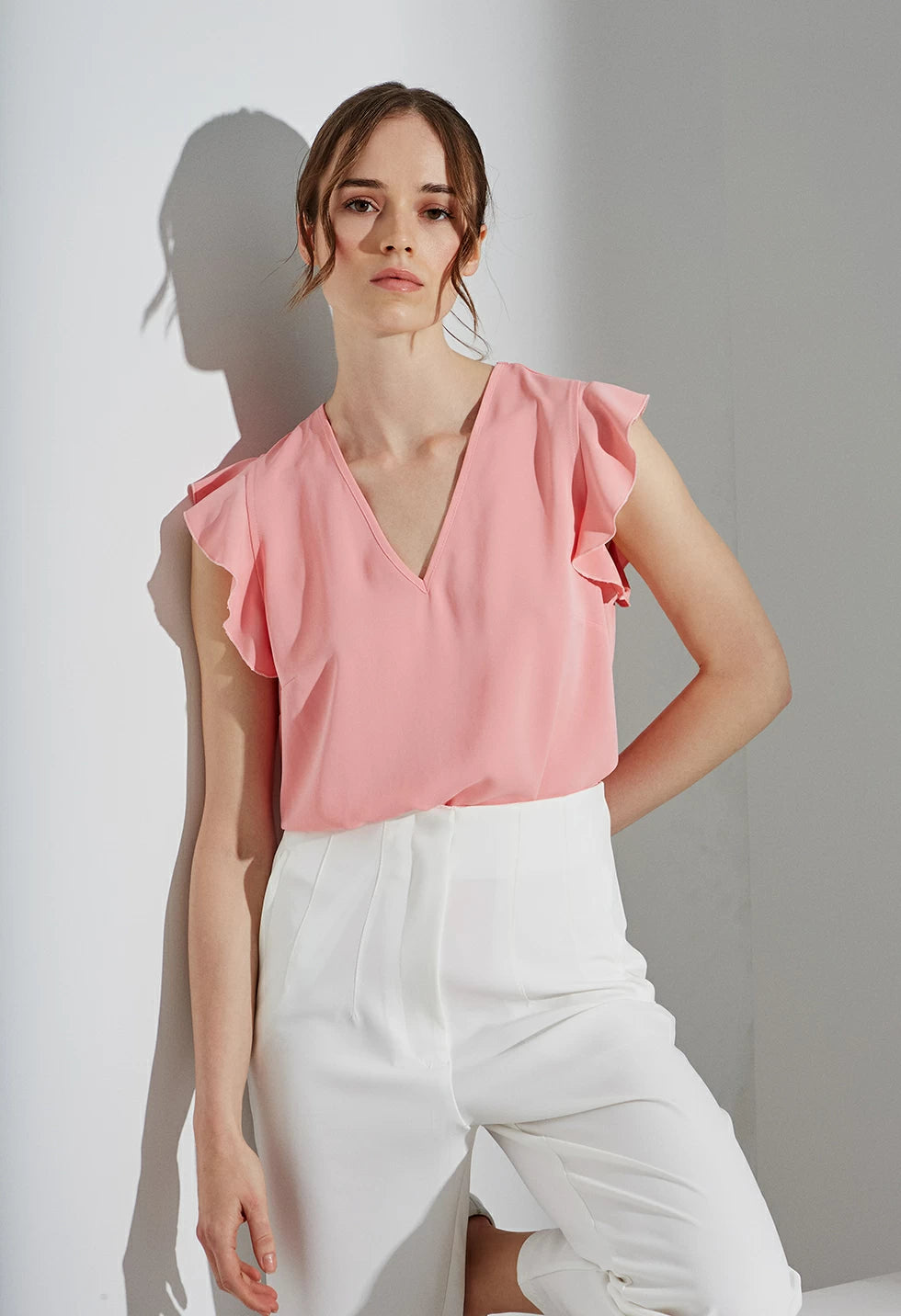 Μονόχρωμη μπλούζα με V ντεκολτέ, λεπτομέρεια βολάν στους ώμους, κανονική εφαρμογή.