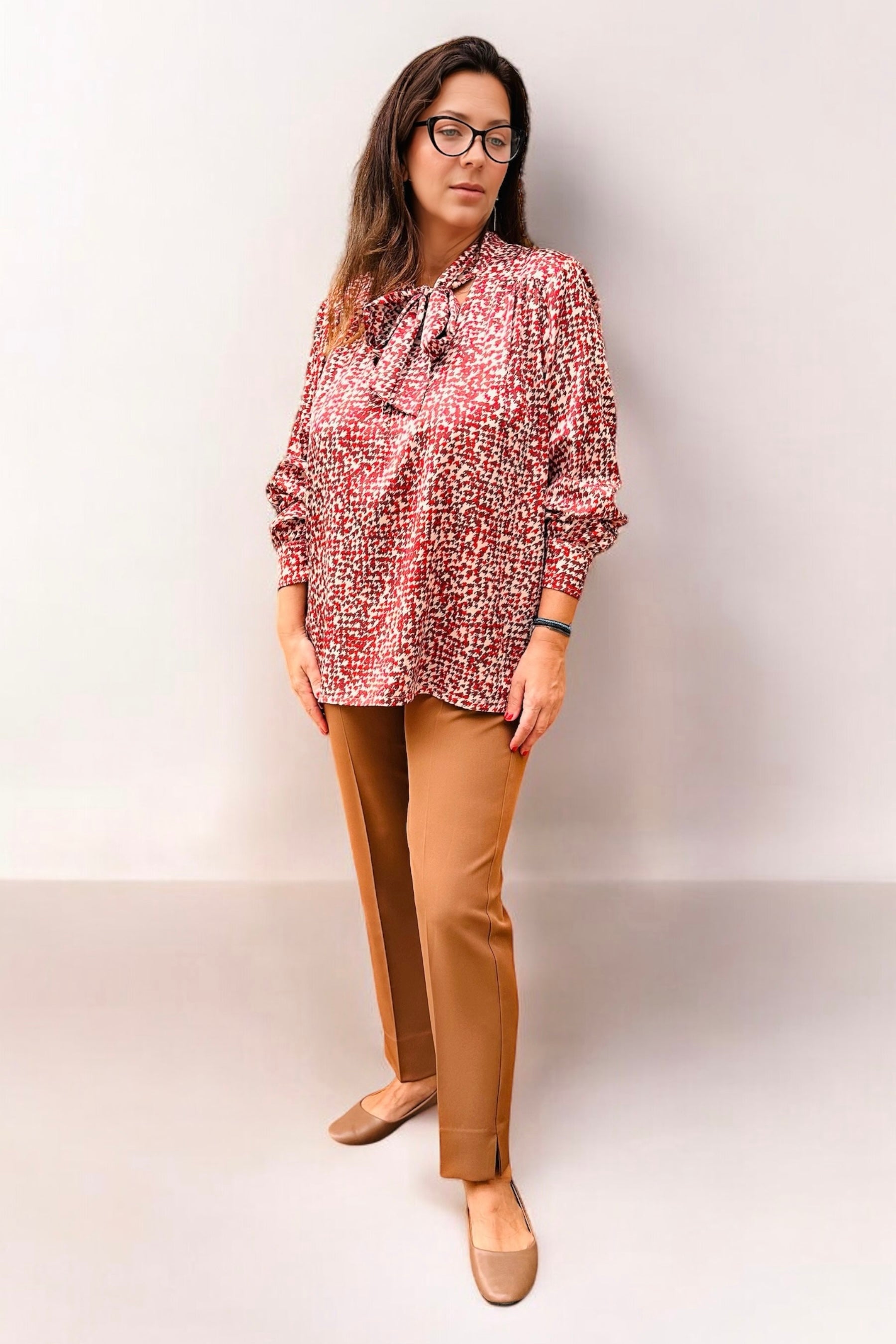 Πουκάμισο σε φαρδιά γραμμή από αέρινο ύφασμα, με φρέσκο leopard pattern και δέσιμο στο λαιμό σε άνετη γραμμή, που μπορεί να φορεθεί προσφέροντας άνεση και στυλ. Το χαλαρό του κόψιμο μαζί με το V ντεκολτέ και το δέσιμο στο λαιμό το καθιστά ιδανικό για καθημερινές εμφανίσεις, ενώ μπορεί να φορεθει άνετα και σε βραδινή έξοδο για ένα πιο sophisticated look.