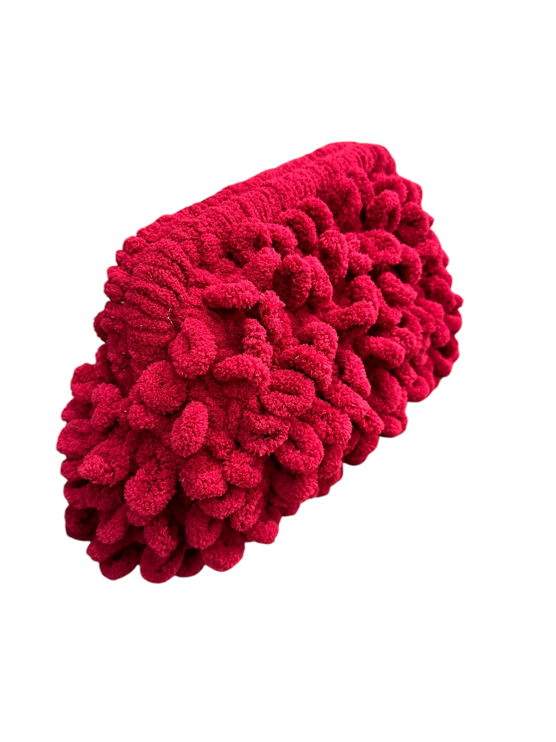 Μια εντυπωσιακή χειροποίητη τσάντα καρπού τύπου clutch με πλεκτό σχέδιο από μαλακό υλικό, που δημιουργεί ένα πλούσιο ανάγλυφο μοτίβο. Το εξωτερικό της είναι αφράτο και κομψό, ενώ το εσωτερικό είναι επενδυμένο με φόδρα σε διάφορα σχέδια, προσδίδοντας μια ρομαντική και θηλυκή πινελιά.