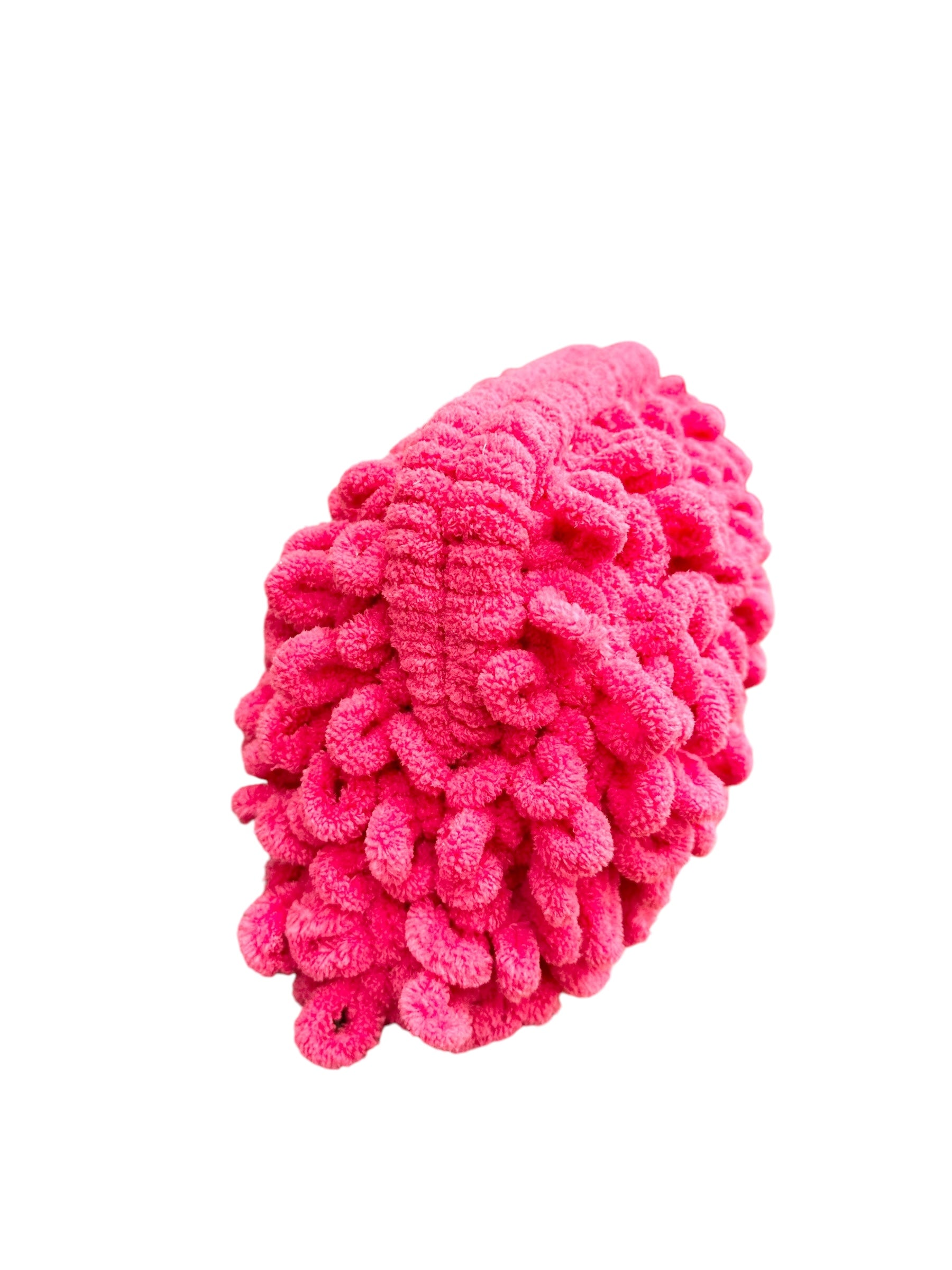 Μια εντυπωσιακή χειροποίητη τσάντα καρπού τύπου clutch με πλεκτό σχέδιο από μαλακό υλικό, που δημιουργεί ένα πλούσιο ανάγλυφο μοτίβο. Το εξωτερικό της είναι αφράτο και κομψό, ενώ το εσωτερικό είναι επενδυμένο με φόδρα σε διάφορα σχέδια, προσδίδοντας μια ρομαντική και θηλυκή πινελιά.