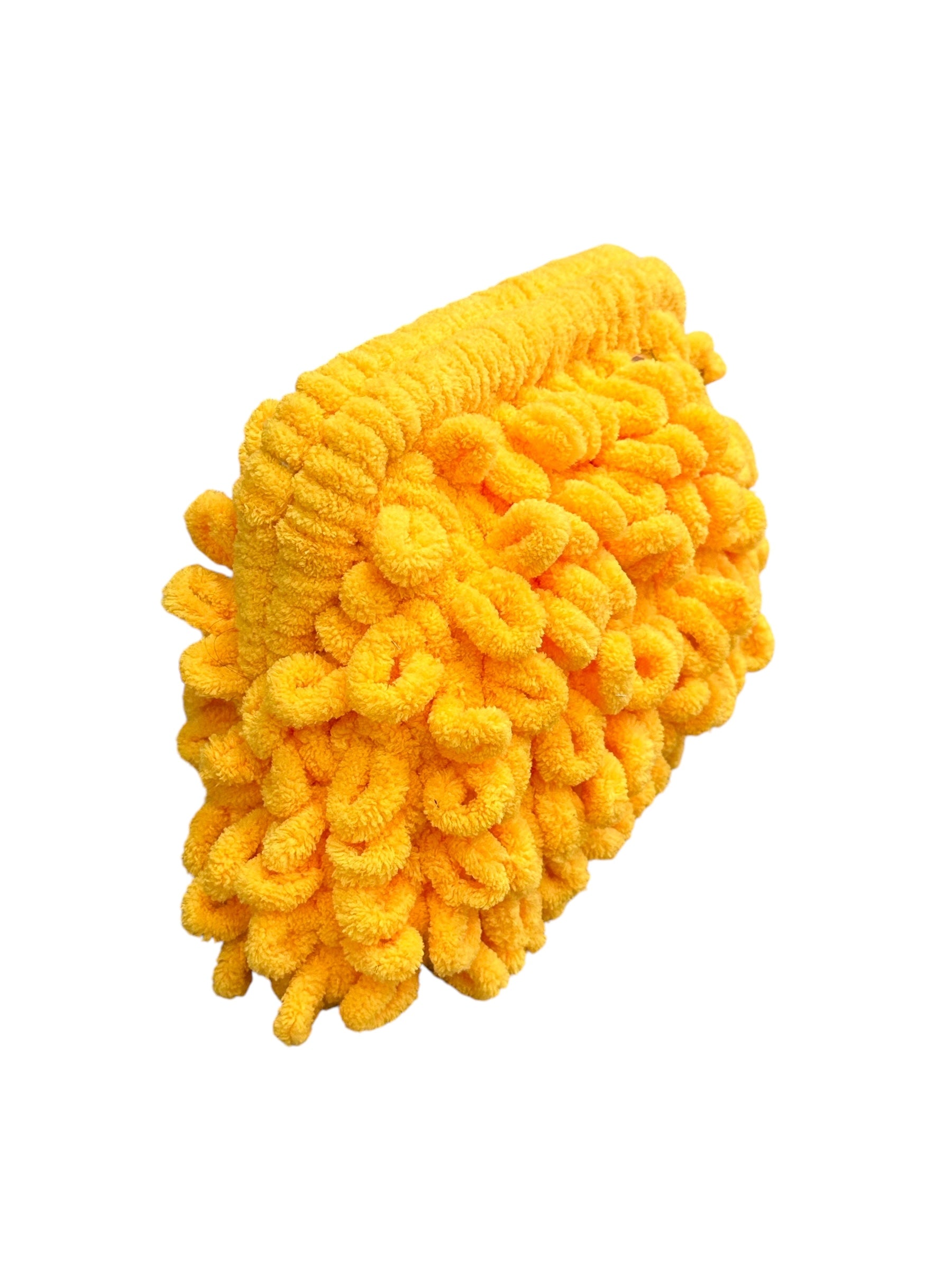 Μια εντυπωσιακή χειροποίητη τσάντα καρπού τύπου clutch με πλεκτό σχέδιο από μαλακό υλικό, που δημιουργεί ένα πλούσιο ανάγλυφο μοτίβο. Το εξωτερικό της είναι αφράτο και κομψό, ενώ το εσωτερικό είναι επενδυμένο με φόδρα σε διάφορα σχέδια, προσδίδοντας μια ρομαντική και θηλυκή πινελιά.