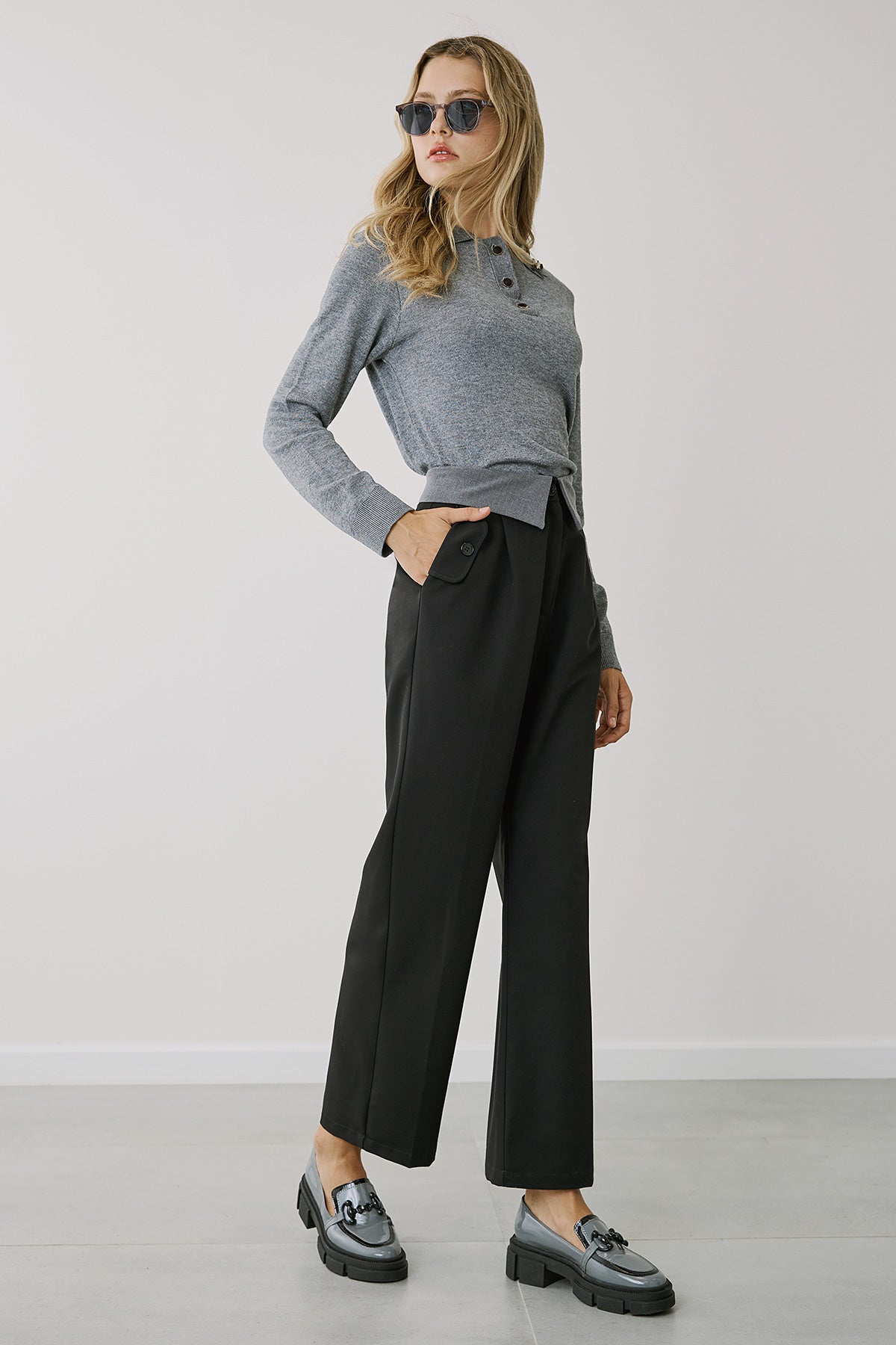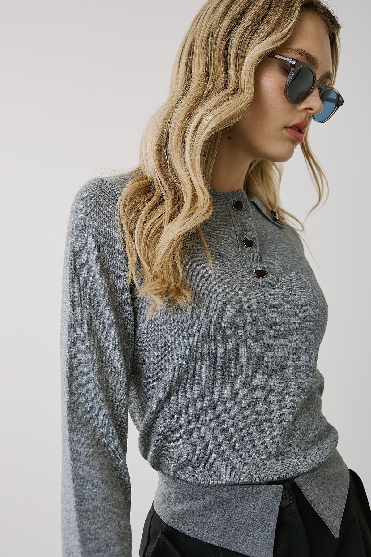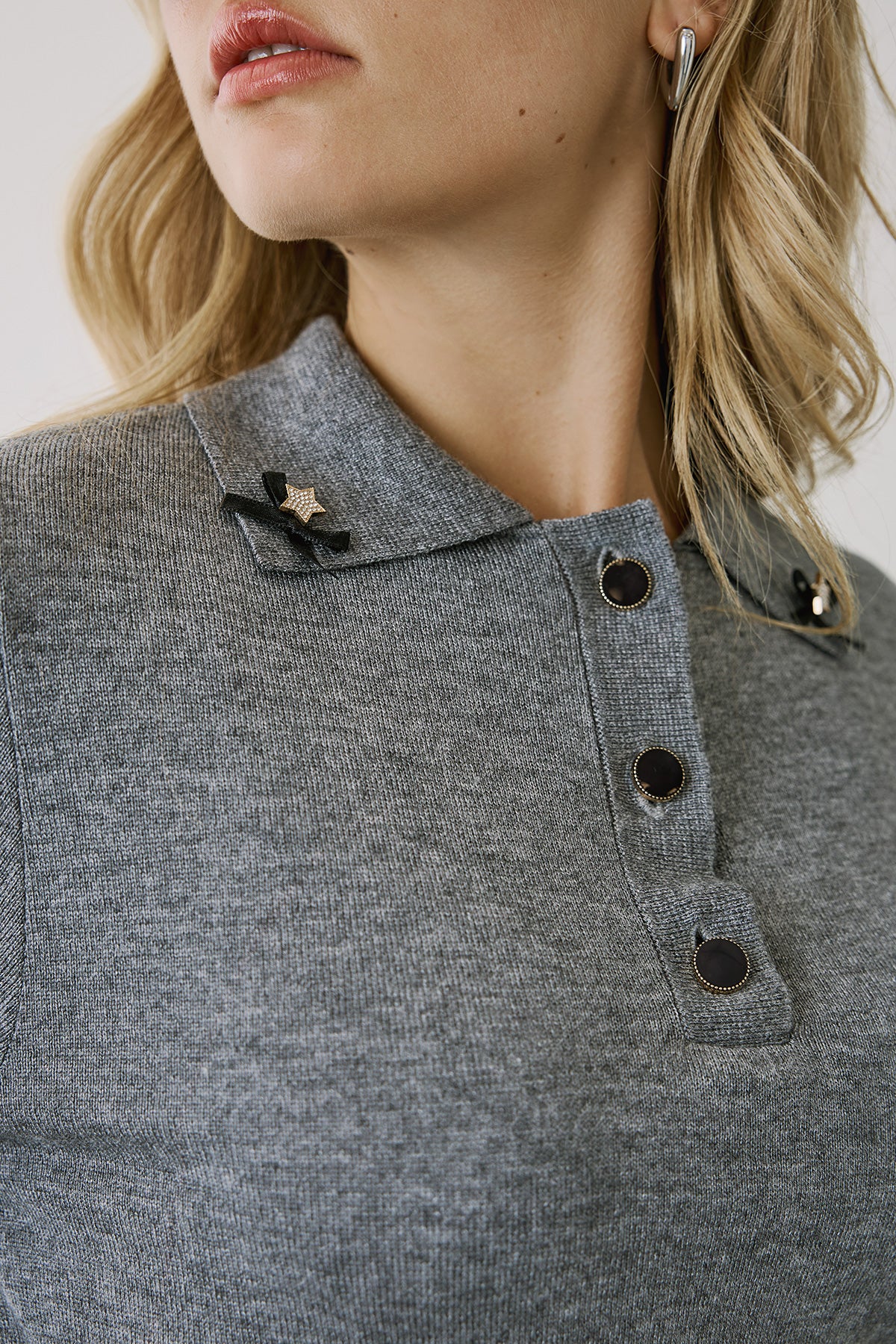 Αναδείξτε το στυλ σας με αυτή την κομψή γκρι πλεκτή μπλούζα με γιακά και μακρύ μανίκι. Διαθέτει διακριτικά κουμπιά στο μπροστινό μέρος και διακοσμητική λεπτομέρεια στον γιακά για μια μοντέρνα πινελιά. Η απαλή και ζεστή υφή της την καθιστά ιδανική επιλογή για καθημερινές εμφανίσεις ή για πιο επίσημες περιστάσεις. Συνδυάζεται εύκολα με παντελόνια και φούστες, προσφέροντας έναν αέρα διαχρονικής κομψότητας. Ιδανική για φθινοπωρινές και χειμωνιάτικες εμφανίσεις συνδυαστικά σε όλες τις περιστάσεις με τα παντελόνια και τις φούστες της εταιρείας.