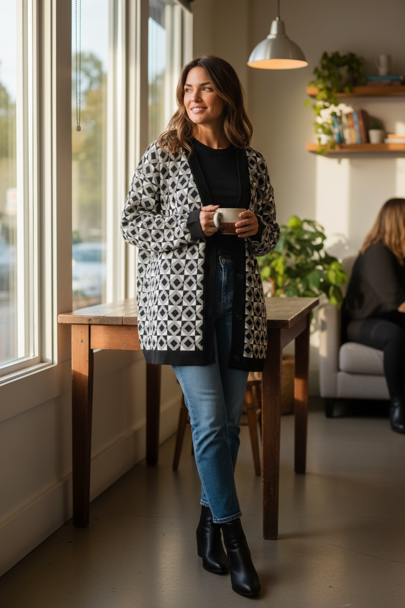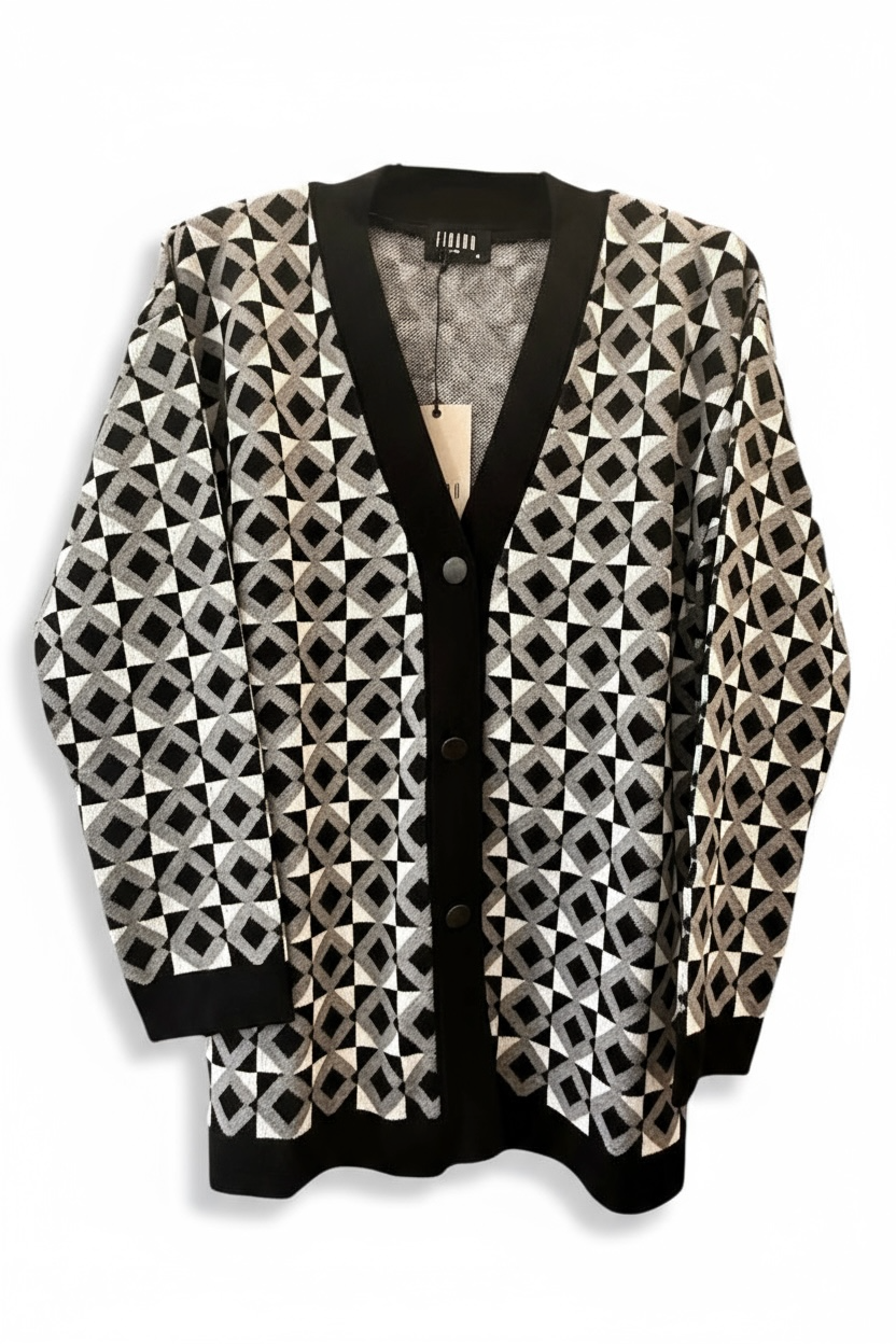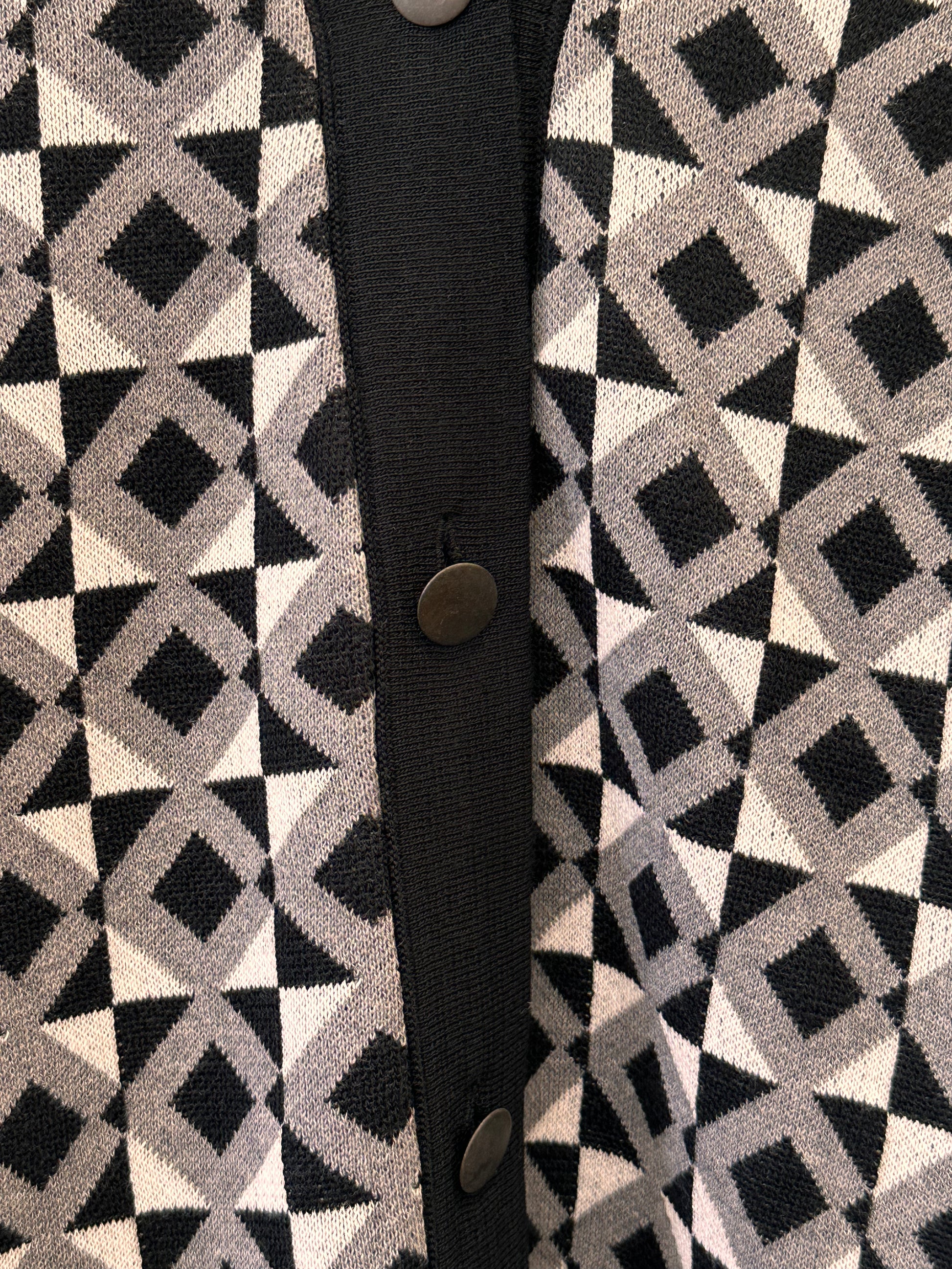Κομψή γυναικεία ζακέτα με γεωμετρικό μοτίβο σε αποχρώσεις του γκρι και του μαύρου. Διαθέτει μακριά μανίκια και κλείσιμο με κουμπιά μπροστά. Ο μοντέρνος σχεδιασμός της προσθέτει μια elegant πινελιά. Ιδανική επιλογή για κομψές εμφανίσεις από το πρωί μέχρι το βράδυ.