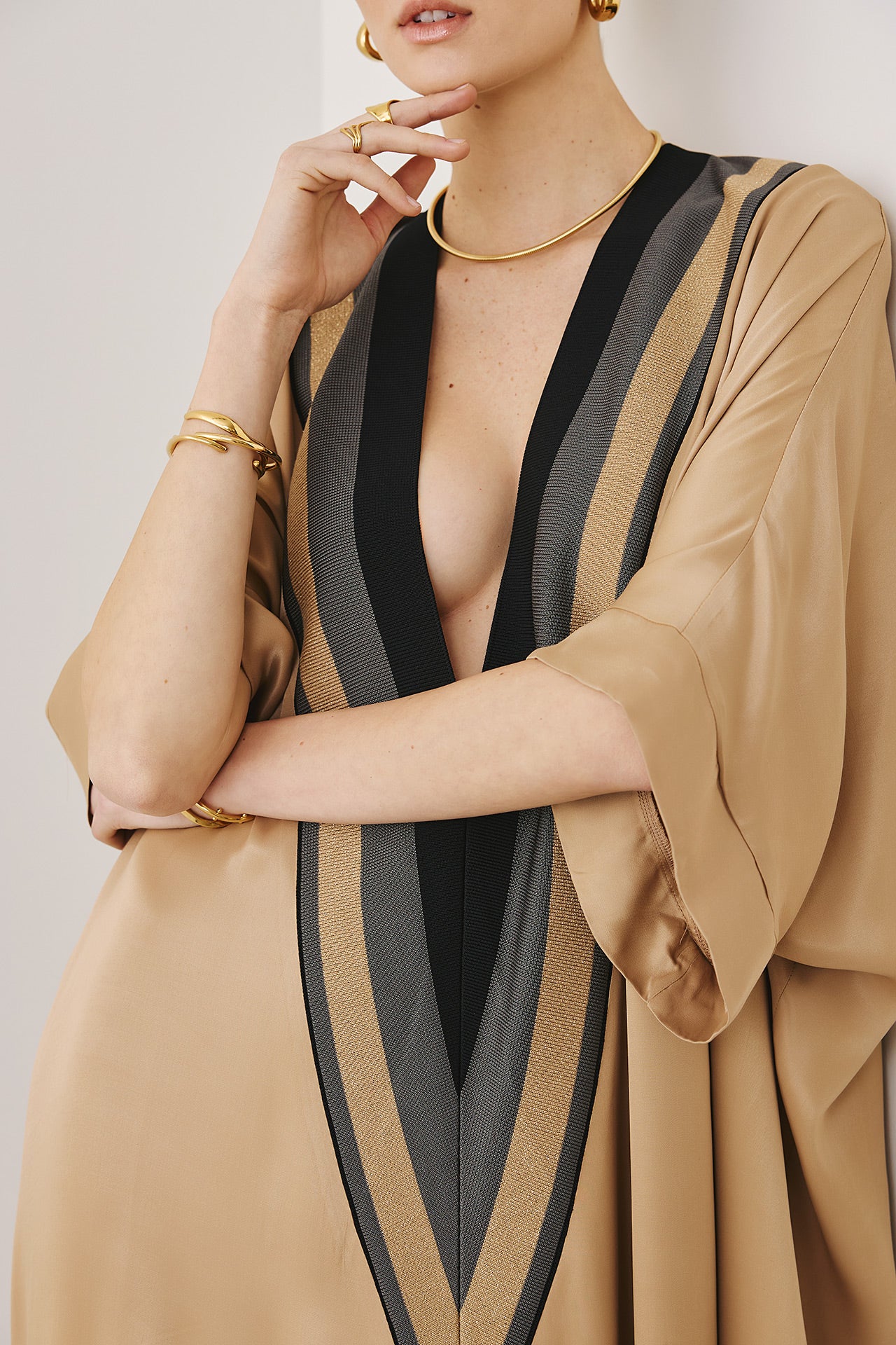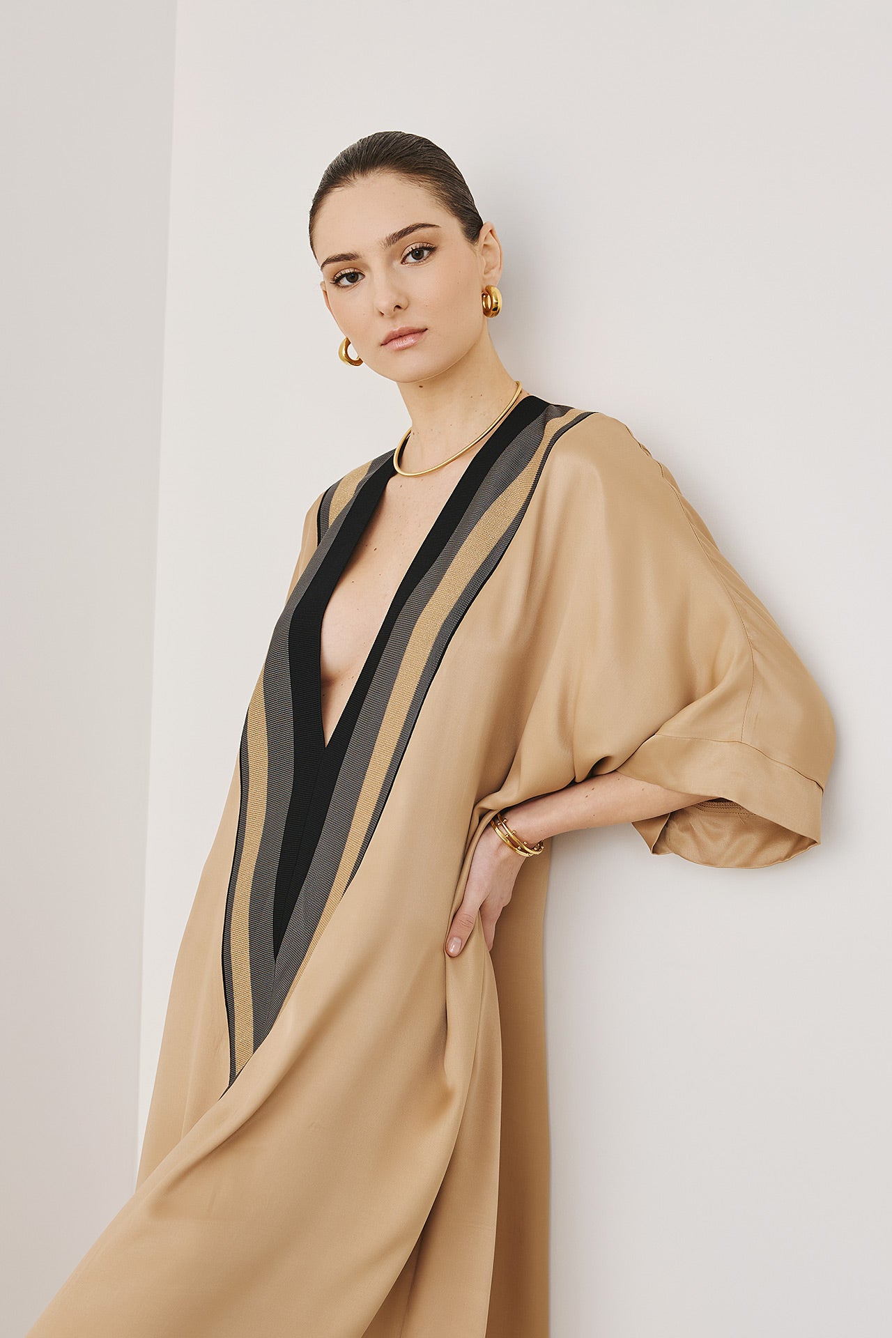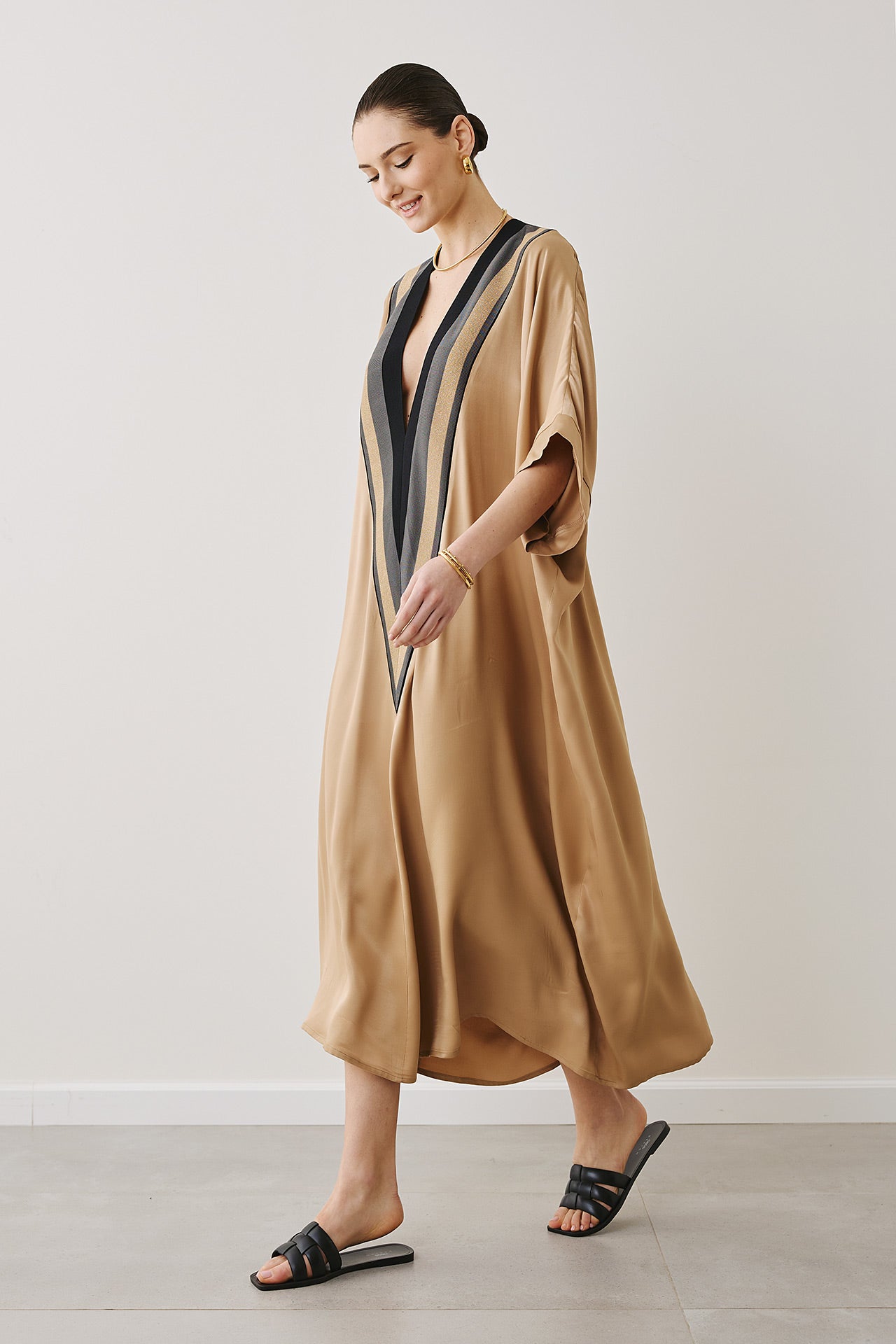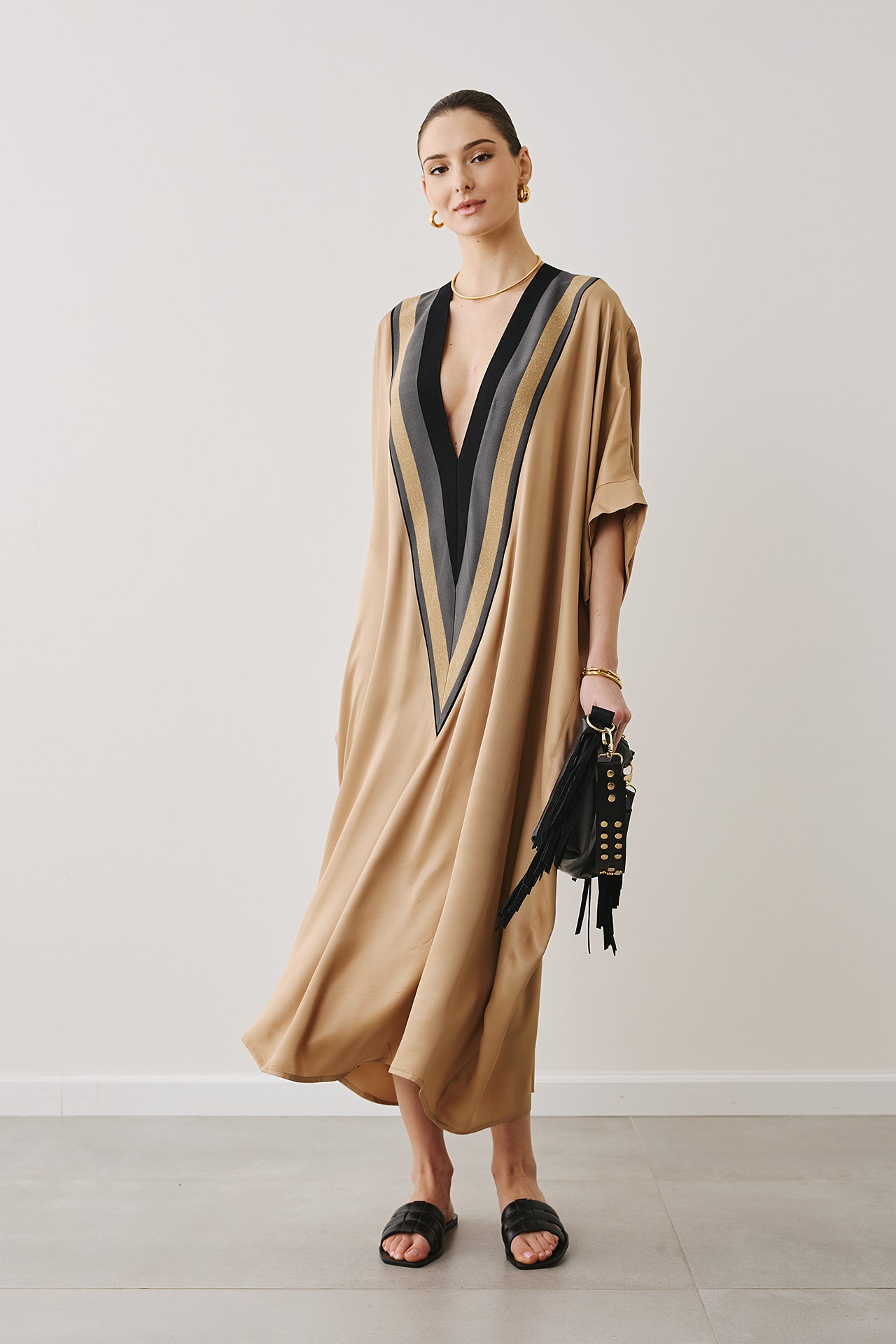 Aυτή τη μοναδική tunic σε μαύρη ή καμελ vicsoze, μεγάλο V και γκρι- gold λεπτομέρεια. Η άνετη γραμμή της και η απαλή υφή την καθιστούν ιδανική για κομψές, καθημερινές αλλά και πιο ιδιαίτερες εμφανίσεις. Μπορεί να φορεθεί άνετα ως φόρεμα με ένα μεσοφόρι ή πάνω από το μαγιό σας.