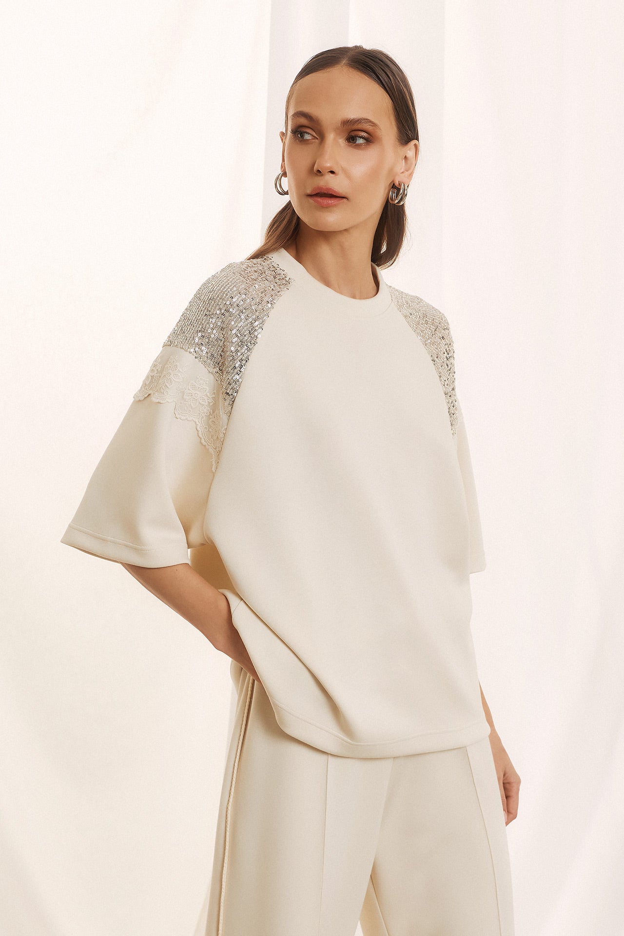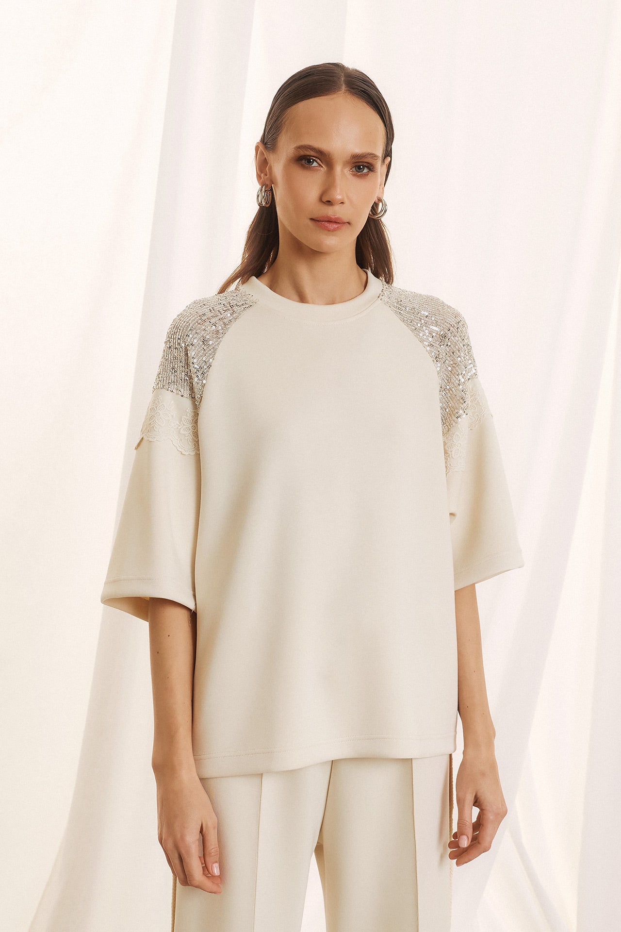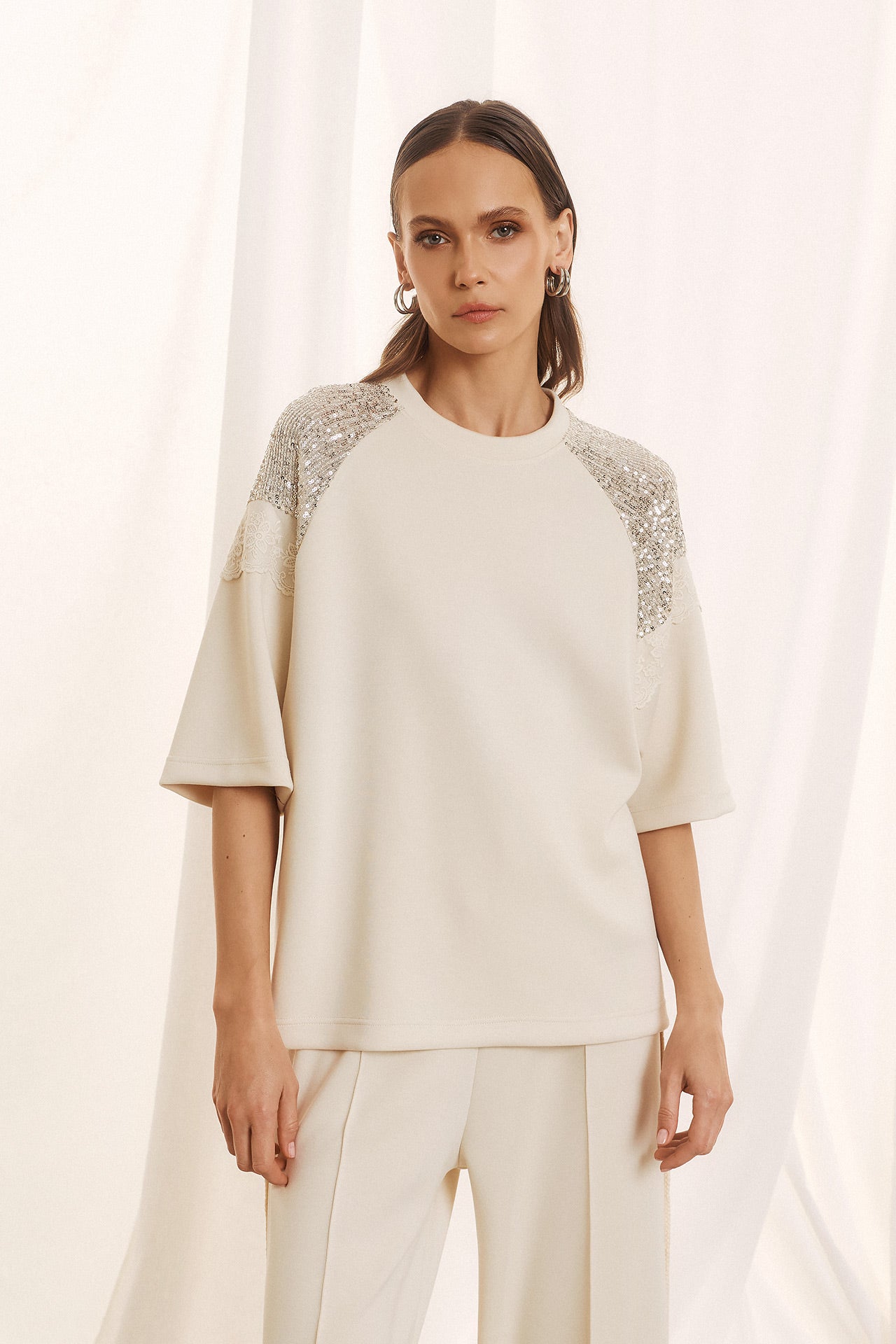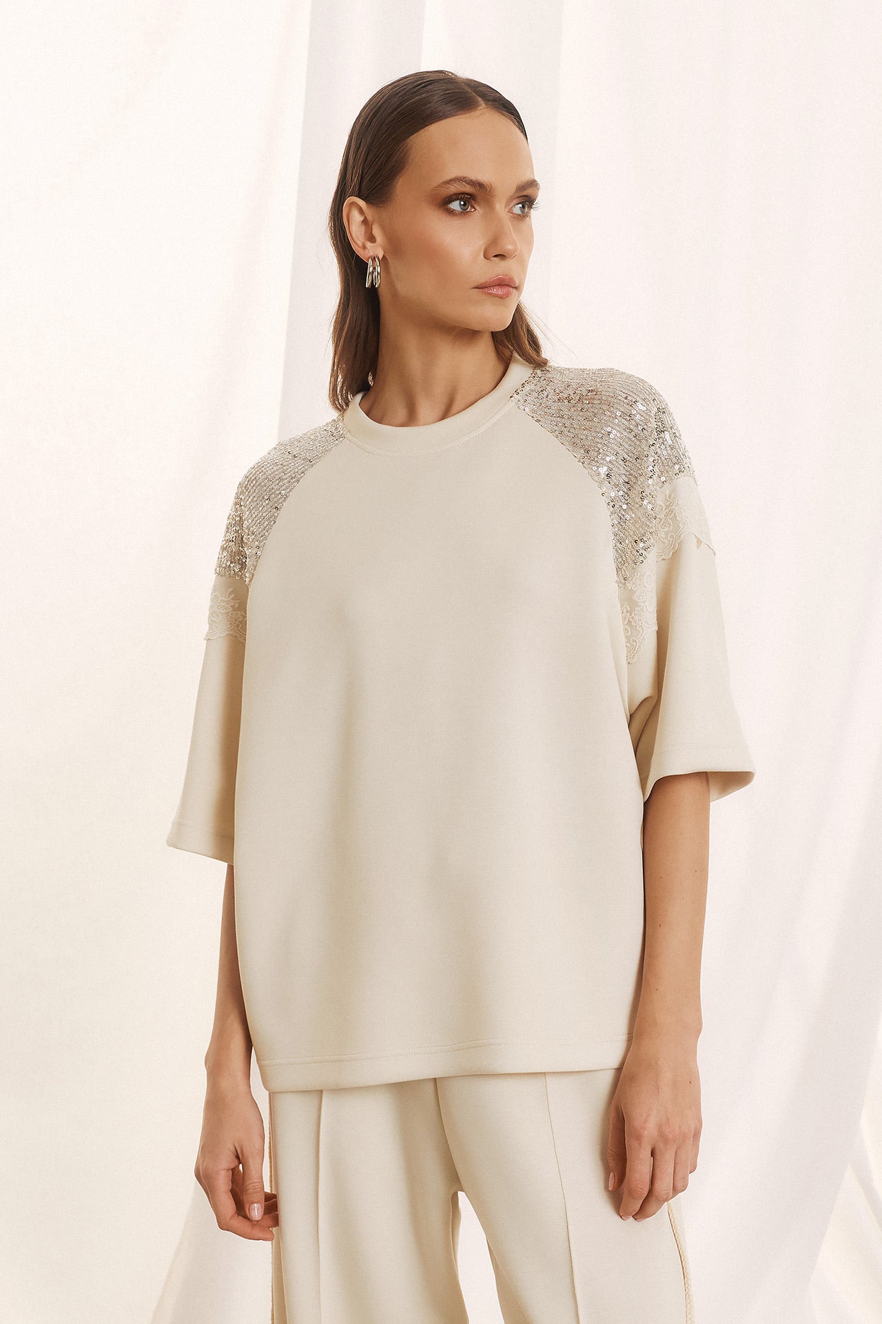 Κομψή και σύγχρονη, αυτή η μπλούζα ξεχωρίζει χάρη στις εντυπωσιακές λεπτομέρειες με μαύρη δαντέλα και παγιέτες στους ώμους. Ο oversized σχεδιασμός με κοντό μανίκι προσφέρει άνεση, ενώ οι λαμπερές πινελιές δίνουν μια αίσθηση πολυτέλειας που την κάνει ιδανική για ιδιαίτερες περιστάσεις.