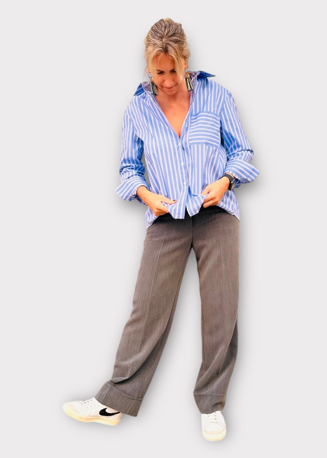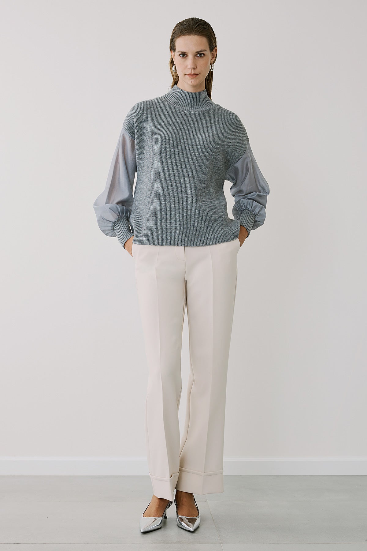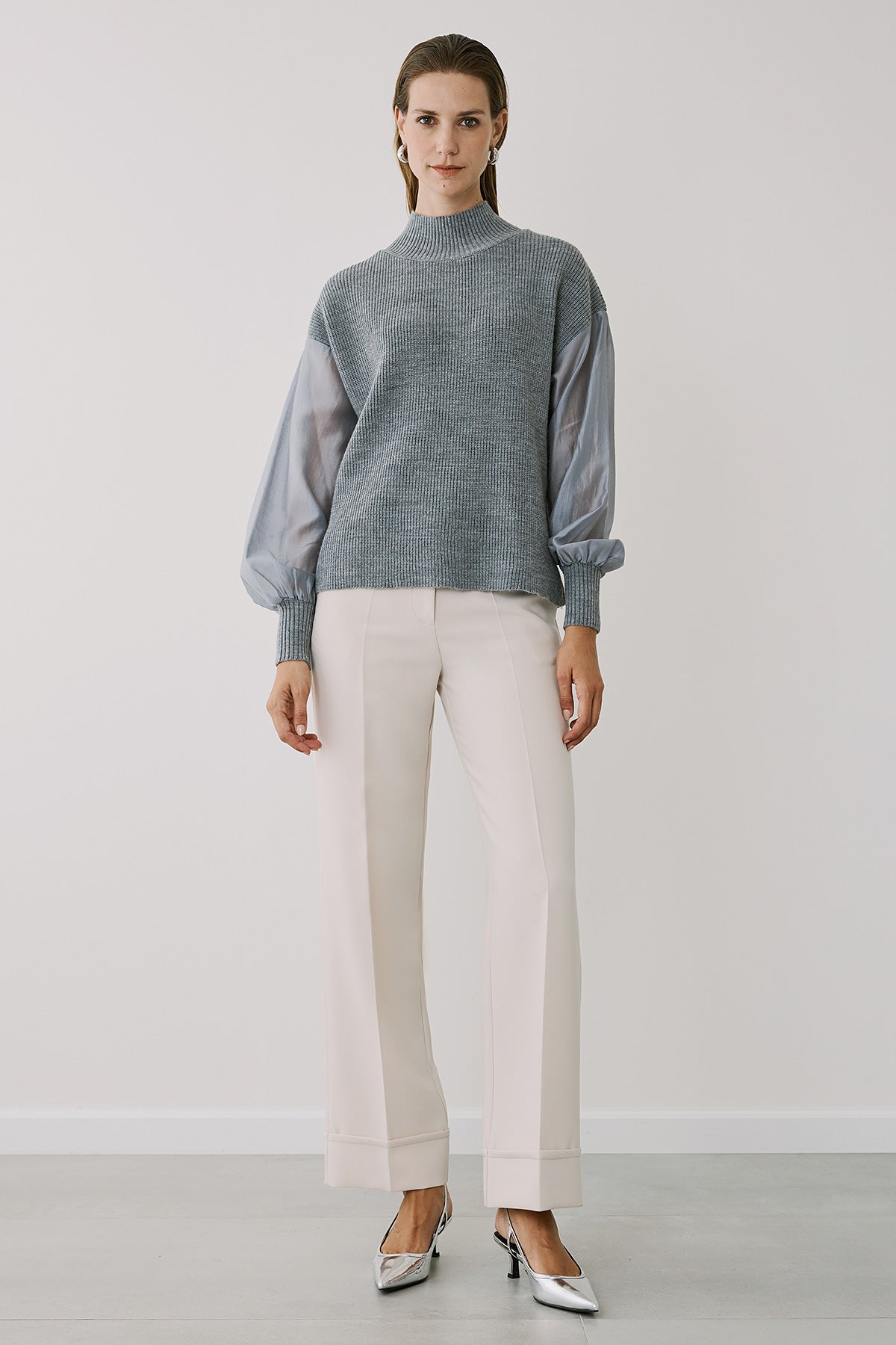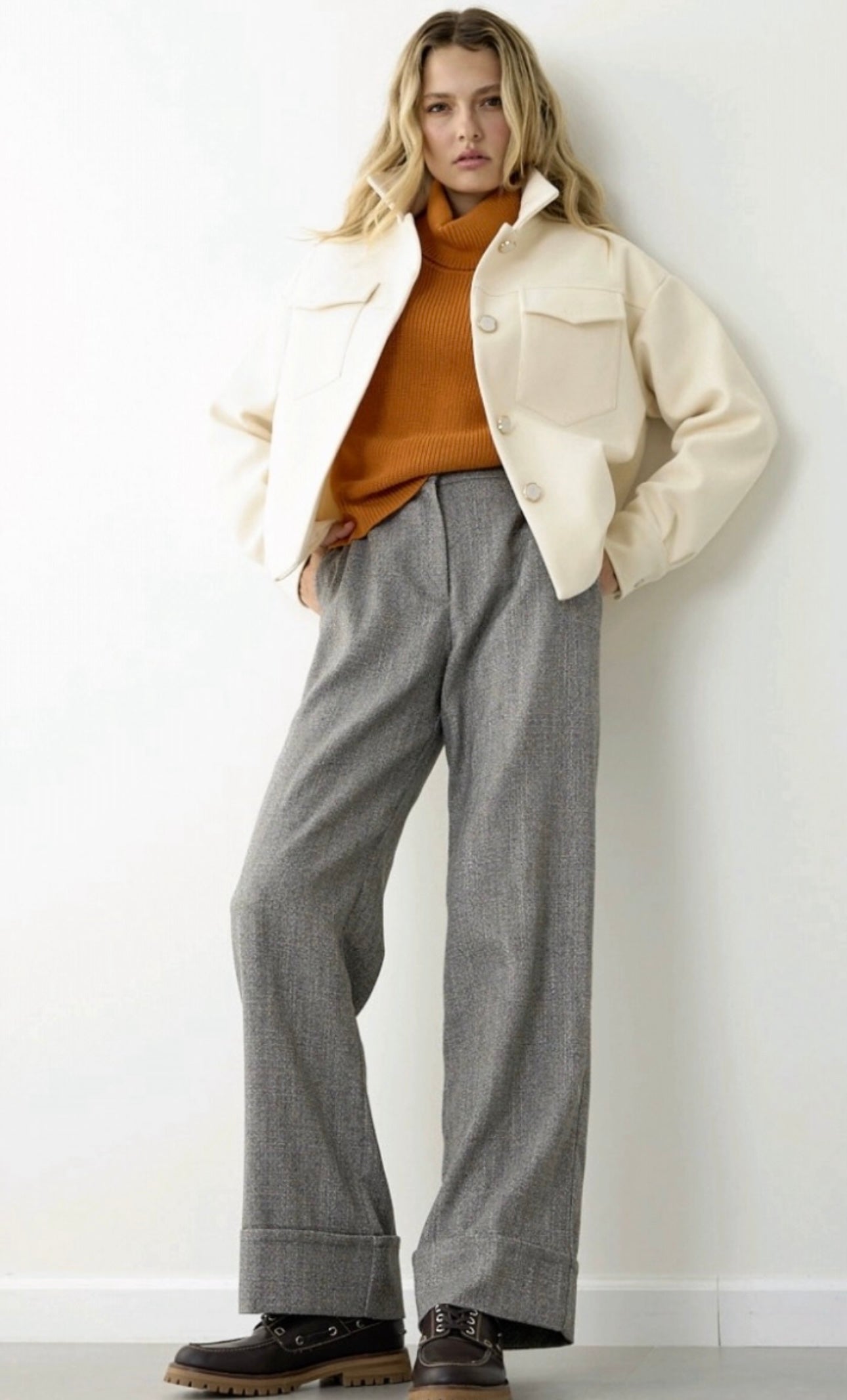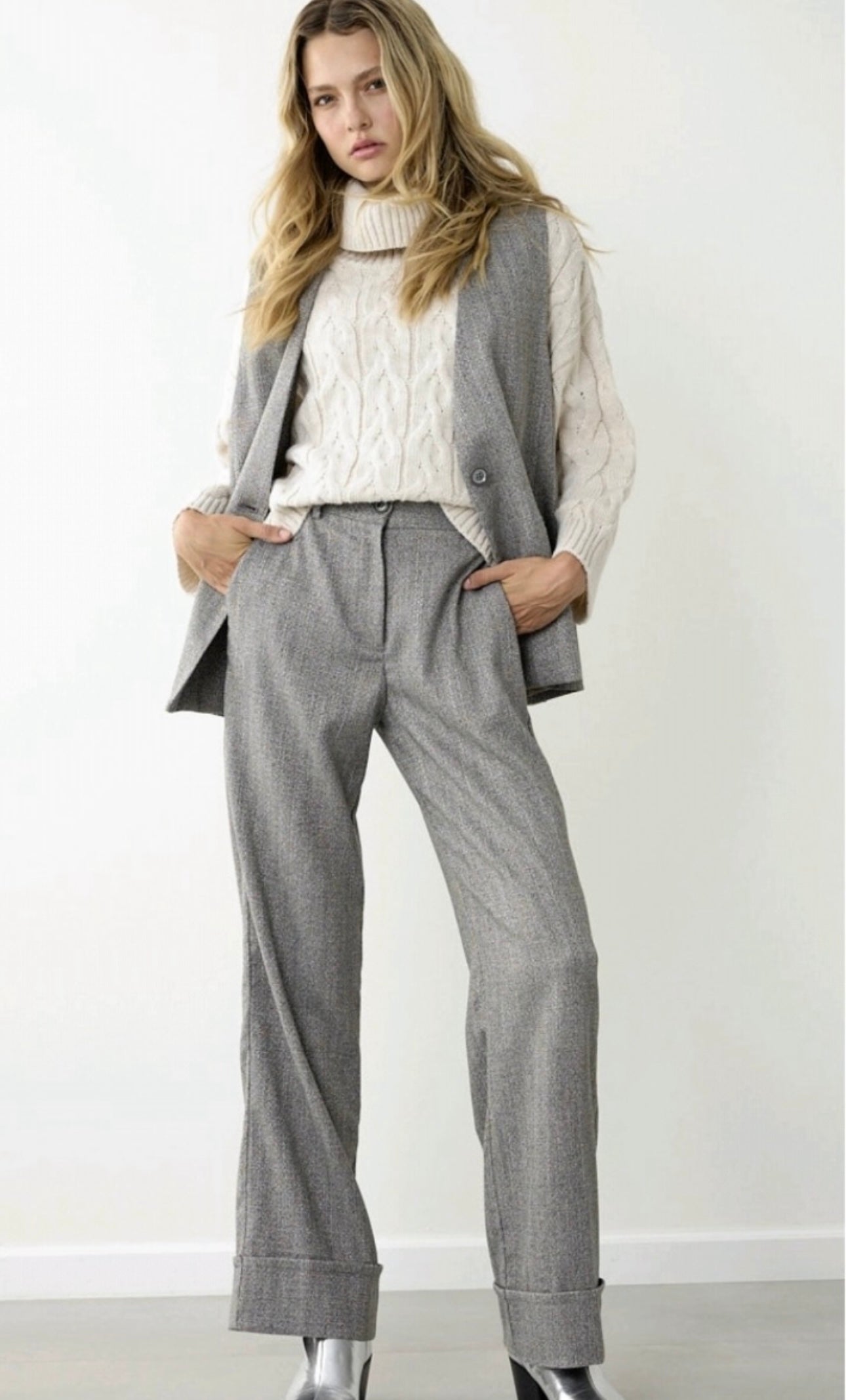 Αυτό το μοντέρνο φαρδύ παντελόνι με μεγάλο ρεβέρ συνδυάζει άνεση και στυλ, ιδανικό για καθημερινές αλλά και πιο επίσημες εμφανίσεις. Η χαλαρή γραμμή του χαρίζει ελευθερία κινήσεων και κομψή σιλουέτα, ενώ το ρεβέρ στον ποδόγυρο προσθέτει μία ιδιαίτερη λεπτομέρεια που κάνει τη διαφορά.