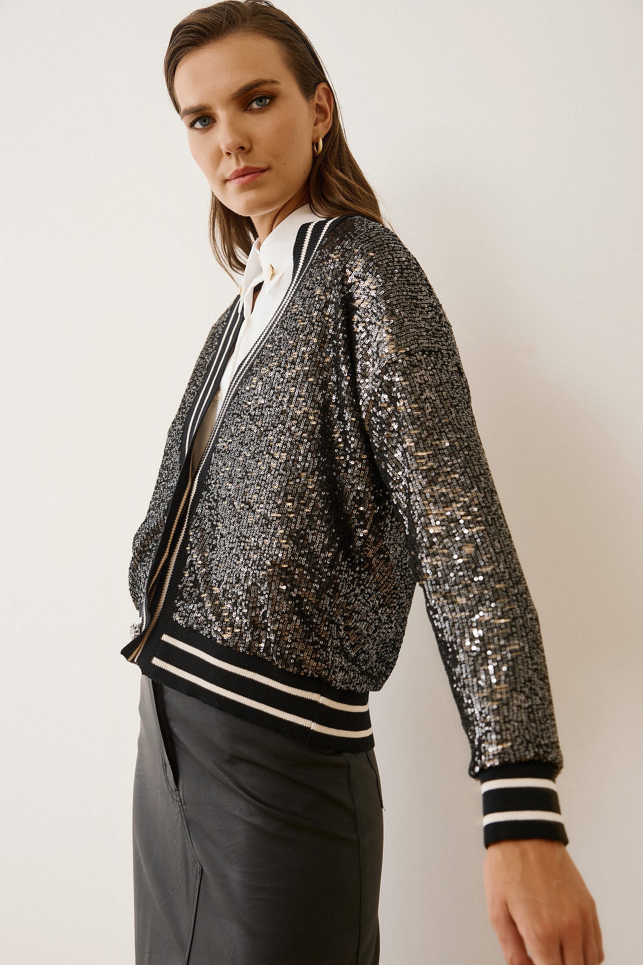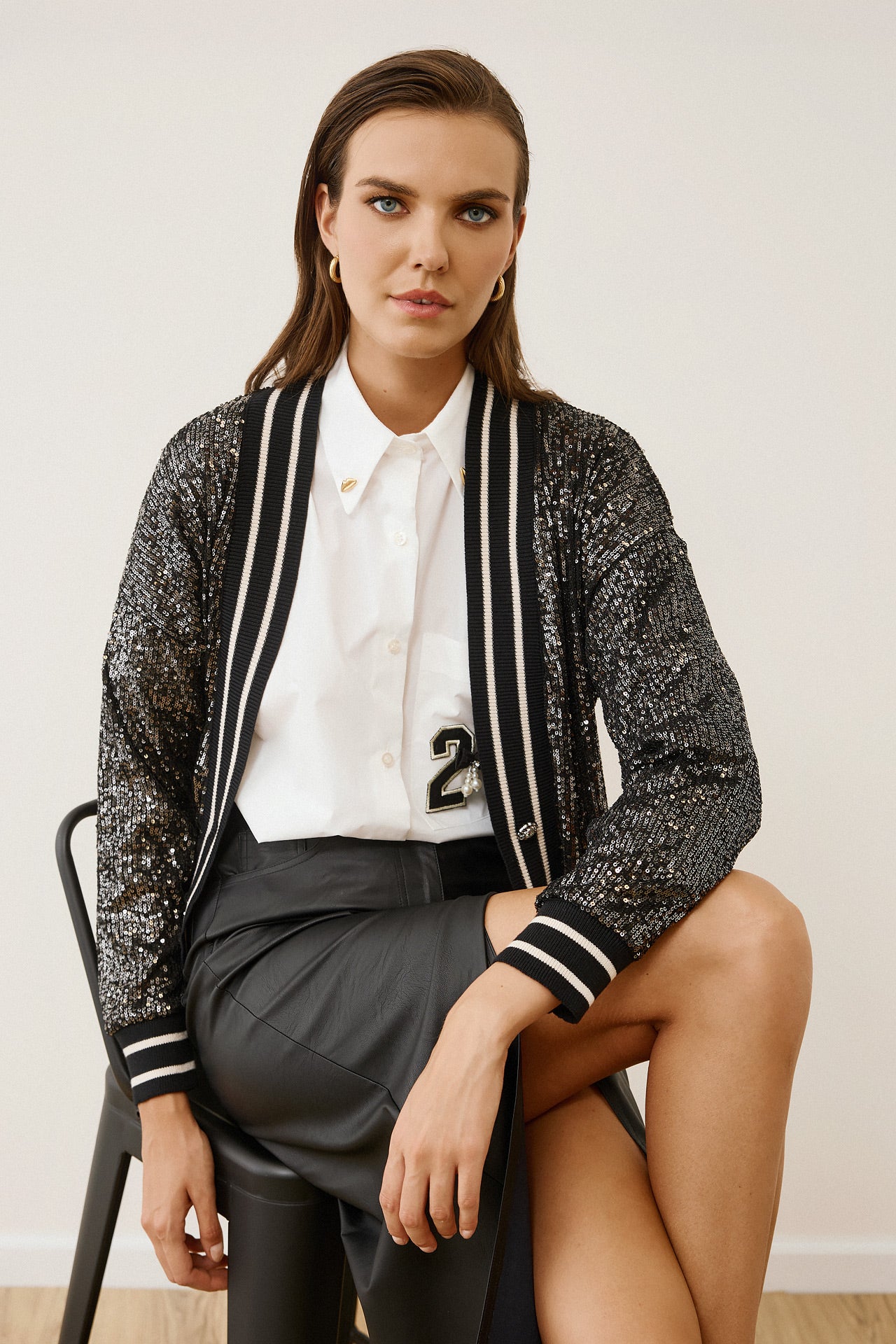 Αναδείξτε το στυλ σας με αυτήν την εντυπωσιακή ζακέτα γεμάτη λαμπερές παγιέτες. Με χαλαρή γραμμή για άνεση και μοντέρνο V με λευκές λεπτομέρειες, αποτελεί το απόλυτο fashion κομμάτι για τις βραδινές σας εξόδους. Ο συνδυασμός λάμψης και κομψότητας την καθιστά ιδανική για να ξεχωρίσετε σε κάθε περίσταση.