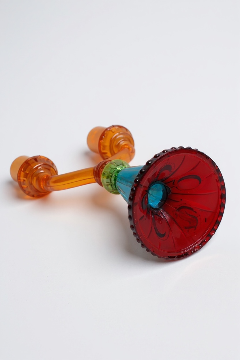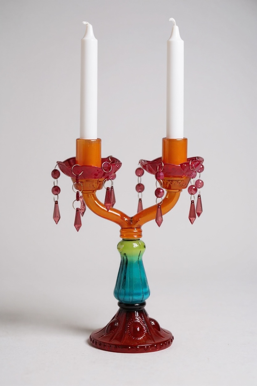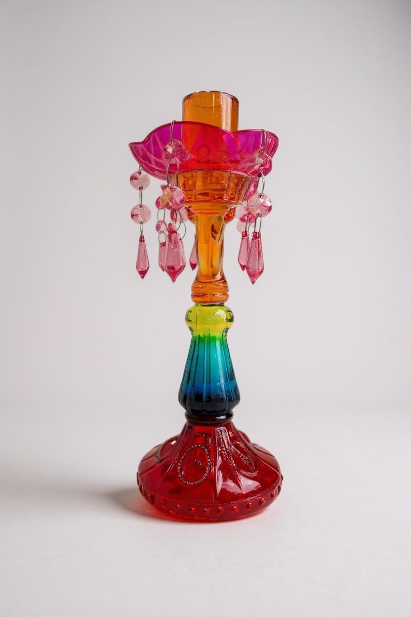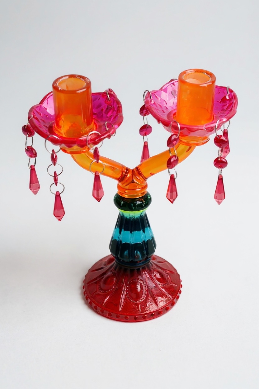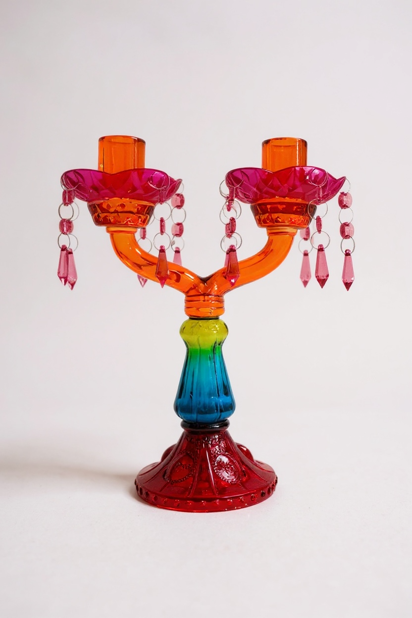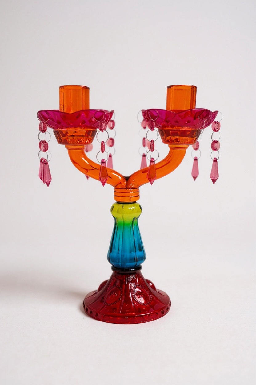 Κατασκευασμένα από ανθεκτικό ακρυλικό υλικό, τα κηροπήγια συνδυάζουν έντονα χρώματα — κόκκινο, πορτοκαλί, μπλε και πράσινο — δημιουργώντας μια παιχνιδιάρικη και ταυτόχρονα κομψή αισθητική. Οι διαφανείς ροζ κρυσταλλικές λεπτομέρειες που κρέμονται από κάθε βραχίονα χαρίζουν λάμψη και κίνηση στο φως των κεριών.