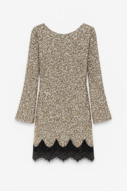Εντυπωσιακό φόρεμα διακοσμημένο με λαμπερές παγιέτες που χαρίζουν εκλεπτυσμένη λάμψη σε κάθε κίνηση. Το τελείωμα από φίνα δαντέλα προσθέτει ρομαντικό χαρακτήρα, ενώ η ανοιχτή πλάτη δημιουργεί μια άκρως θηλυκή και αισθησιακή πινελιά. Τα μακριά μανίκια ισορροπούν το look, προσφέροντας κομψότητα και άνεση. Ιδανική επιλογή για βραδινές εμφανίσεις, επίσημα events και ιδιαίτερες περιστάσεις όπου θέλεις να ξεχωρίσεις με στυλ.