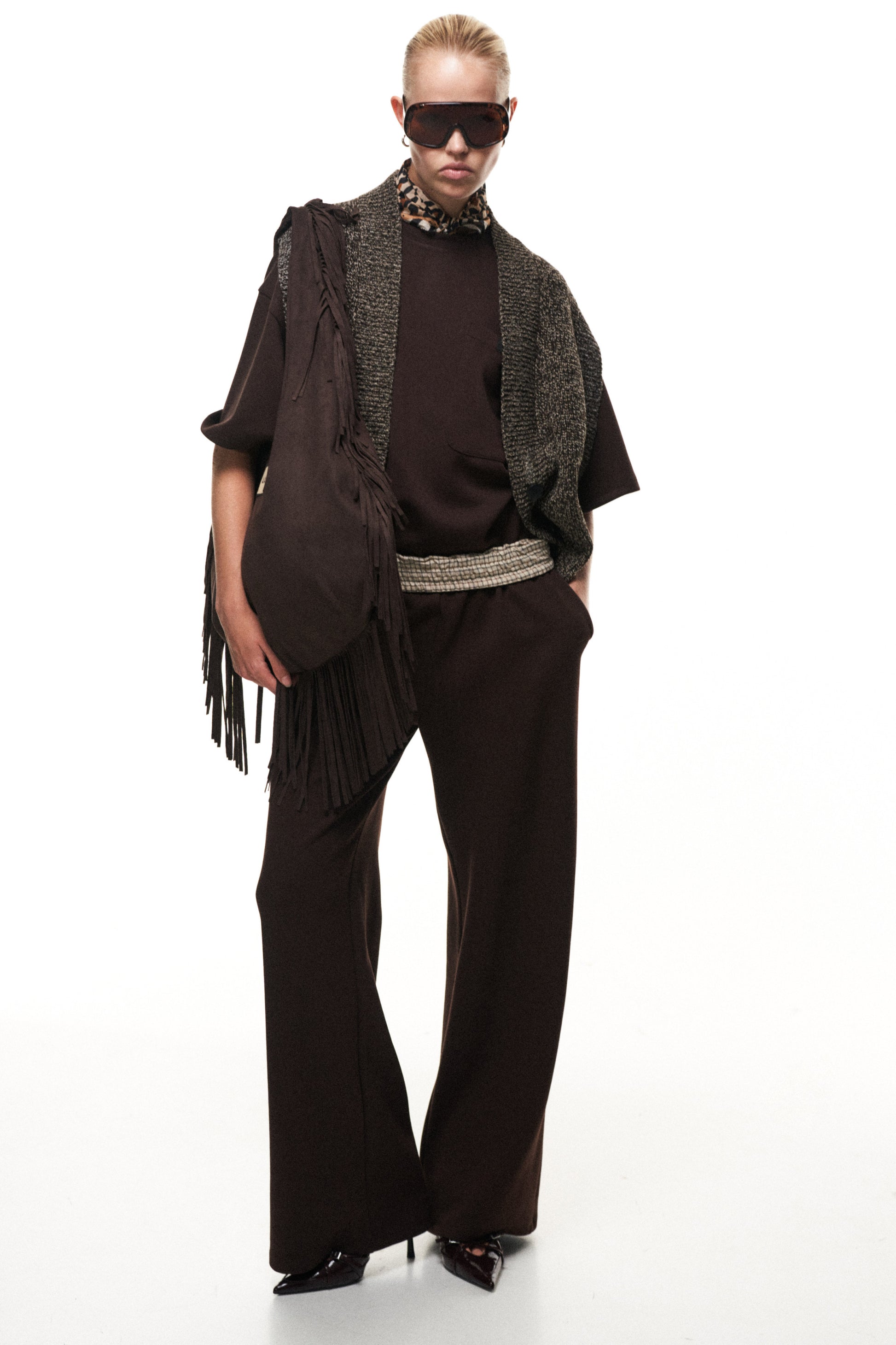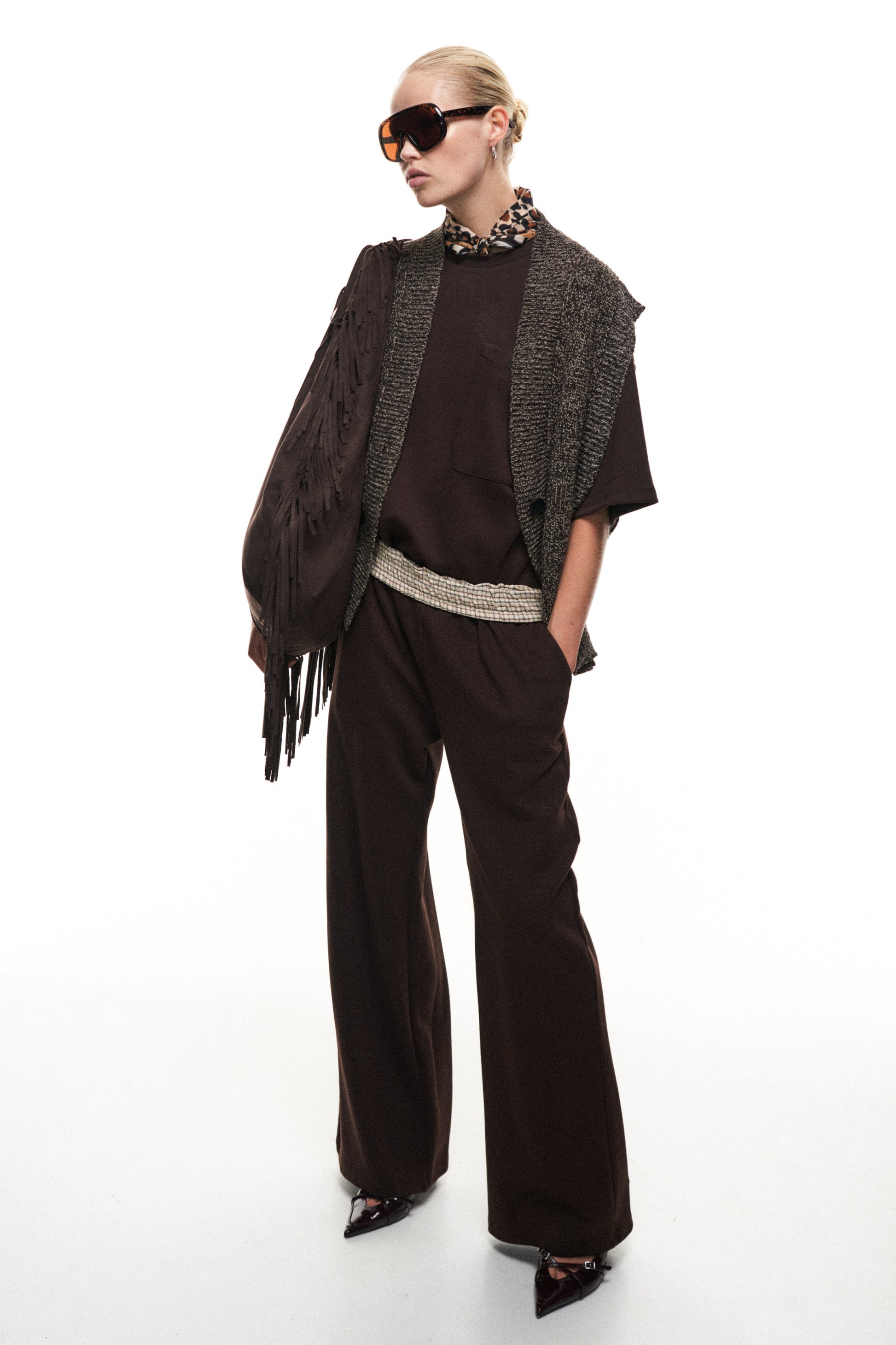 Αυτή η μοναδική τσάντα αποπνέει boho κομψότητα και πολυτέλεια ταυτόχρονα: κατασκευασμένη από απαλό σουέτ με μακριά κρόσσια που κουνιούνται κομψά σε κάθε κίνηση, ενώ η εσωτερική της επένδυση είναι από σατέν, προσφέροντας μια μεταξένια αίσθηση και προστασία στα αντικείμενά σου. Η σιλουέτα της είναι ευέλικτη — θα μπορούσε να φορεθεί ως ώμου ή cross-body (ανάλογα με το λουράκι που θα επιλέξεις) — και συνδυάζει λειτουργικότητα και στιλ. Το ύφασμα σουέτ προσδίδει μια ρουστίκ, αλλά ταυτόχρονα ρομαντική αύρα, ενώ η σατέν φόδρα ανεβάζει την αίσθηση υψηλής ποιότητας. Είναι ιδανική για casual εμφανίσεις, φεστιβάλ, αλλά και για πιο καλοκαιρινές / ρομαντικές εξόδους, προσφέροντας έναν καλλιτεχνικό χαρακτήρα στο σύνολό σου.
