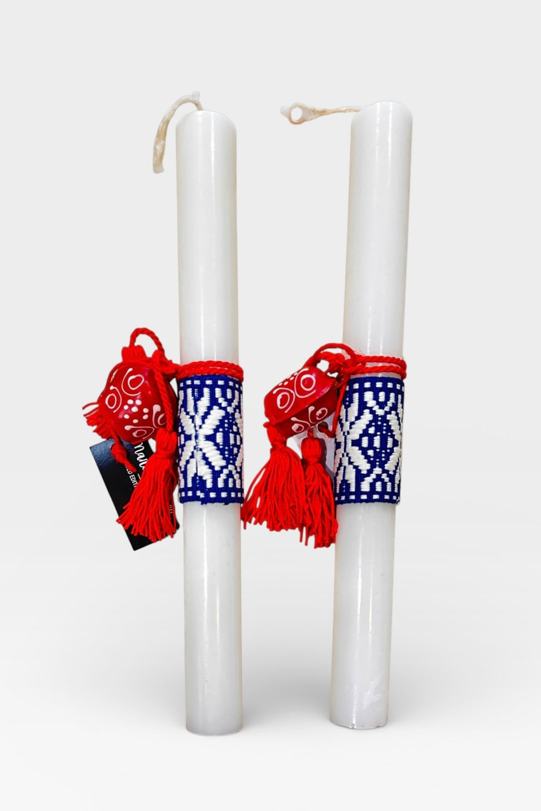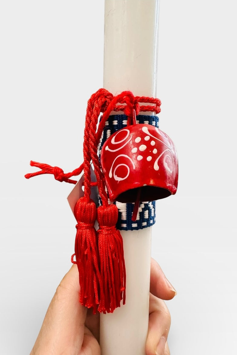 Λαμπάδα με κυλινδρικό λευκό κερί με παραδοσιακό ζωγραφισμένο στο χέρι κουδουνάκι limited δημιουργια της Μαρία Δαβιλλα.