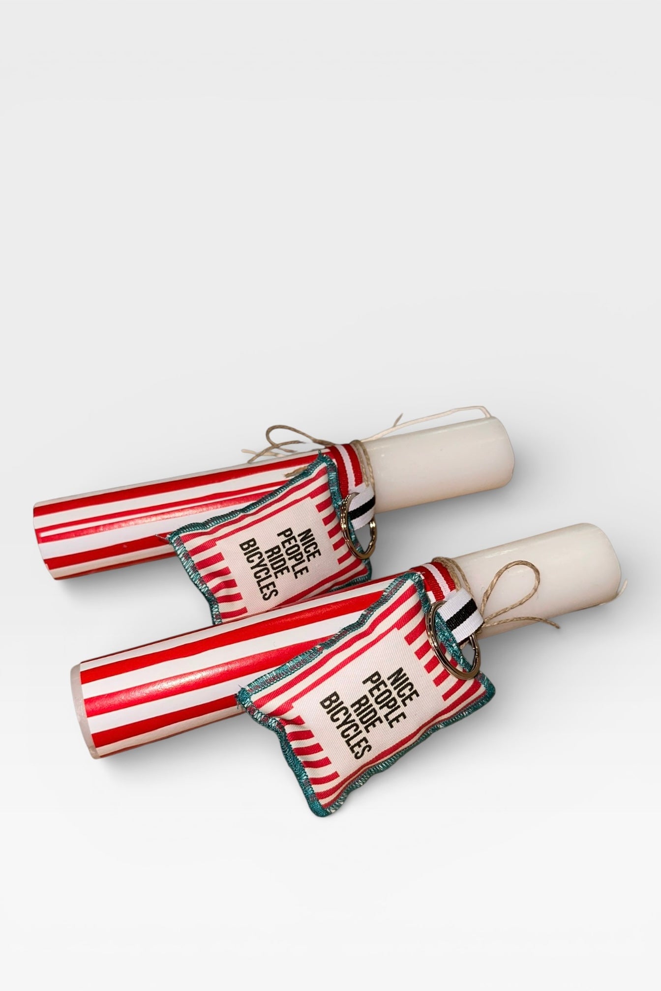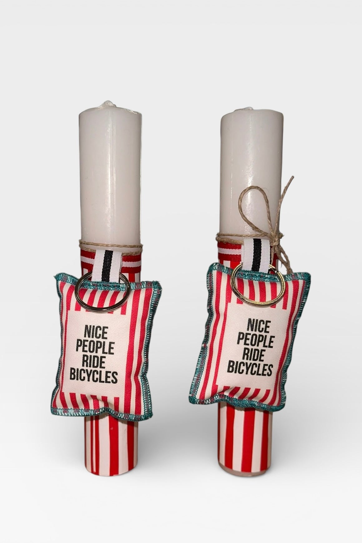 Λαμπάδα με κυλινδρικό λευκό κερί με υφασμάτινο μπρελόκ “Nice People Ride Bicycles” . Μια limited δημιουργία της Μαρία Δαβιλλα.