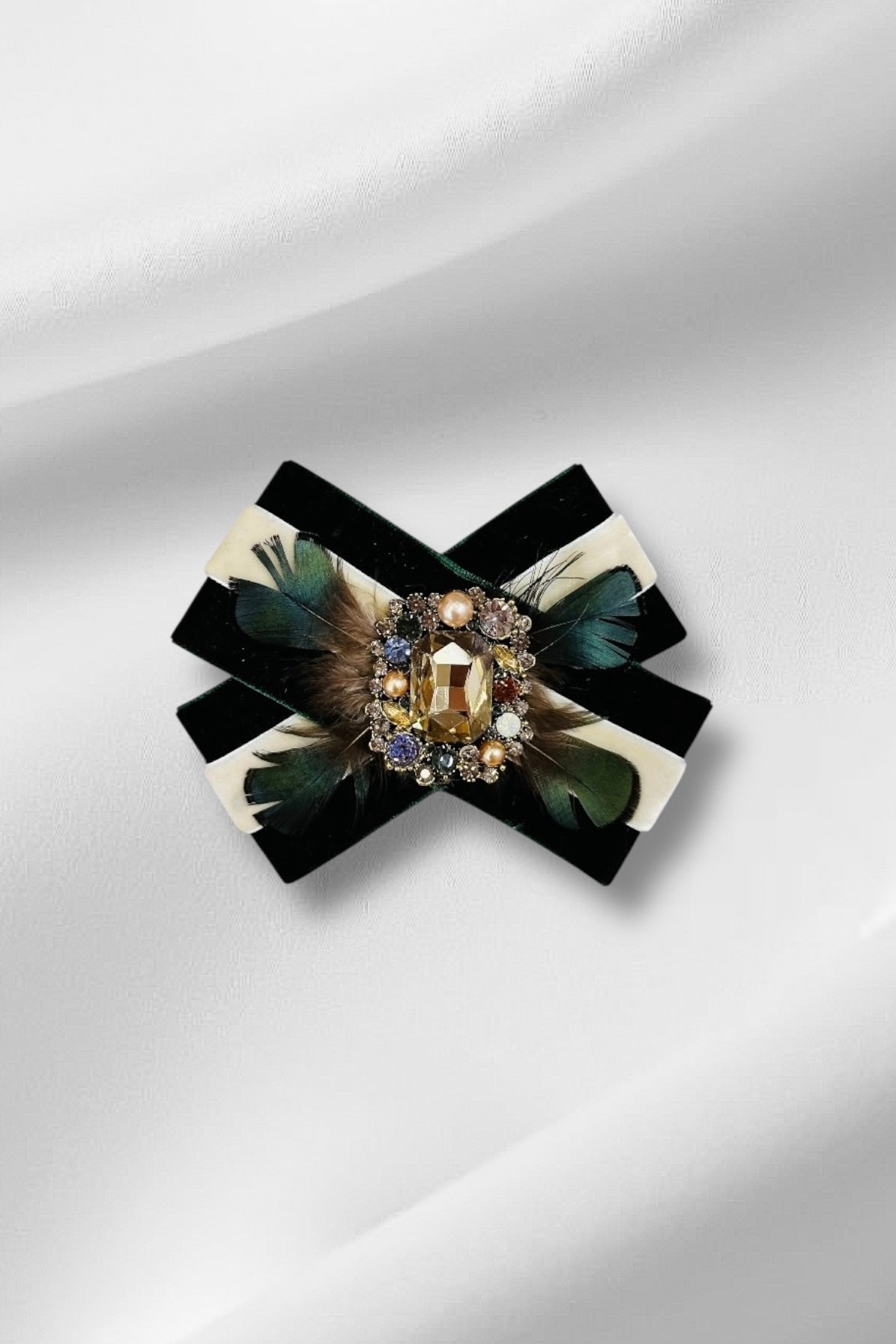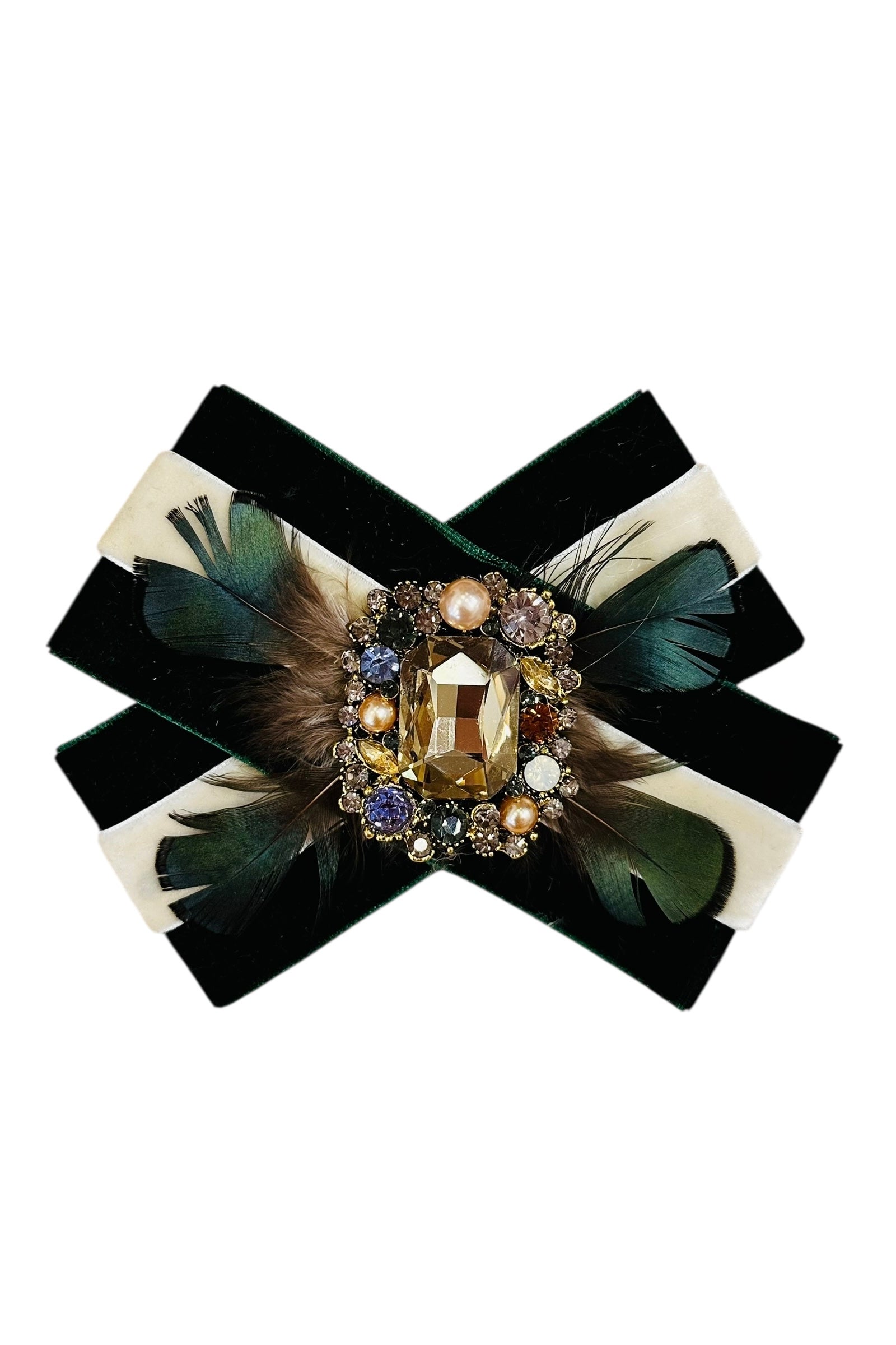 Βιώστε μια νοσταλγική διάθεση με αυτή την διαχρονική καρφίτσα από Πράσινο και εκρού βελούδινη κορδέλα και μία αισθητική καρφίτσα και φτερά.