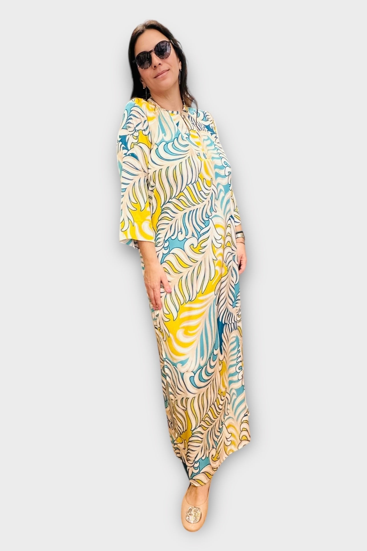 Αναδείξτε τη φυσική σας κομψότητα με αυτό το υπέροχο καφτάνι φόρεμα, ιδανικό για τις ζεστές ημέρες του καλοκαιριού αλλά και για κομψές αποδράσεις. Με χαλαρή γραμμή και αέρινη υφή, προσφέρει μοναδική άνεση χωρίς να θυσιάζει το στυλ. Φοριέται εύκολα από το πρωί ως το βράδυ – στην παραλία, στο νησί ή στην πόλη. Συνδυάστε το με σανδάλια και διακριτικά κοσμήματα για ένα αβίαστα κομψό αποτέλεσμα.