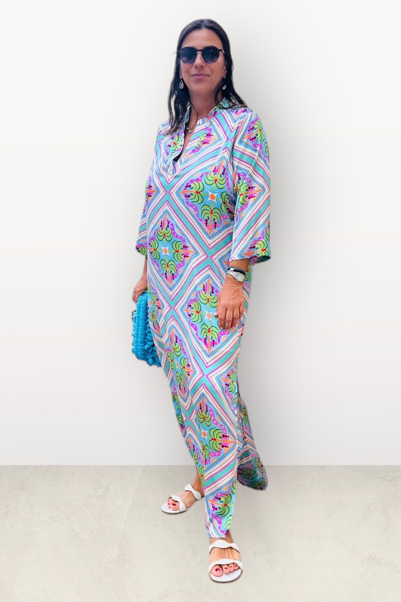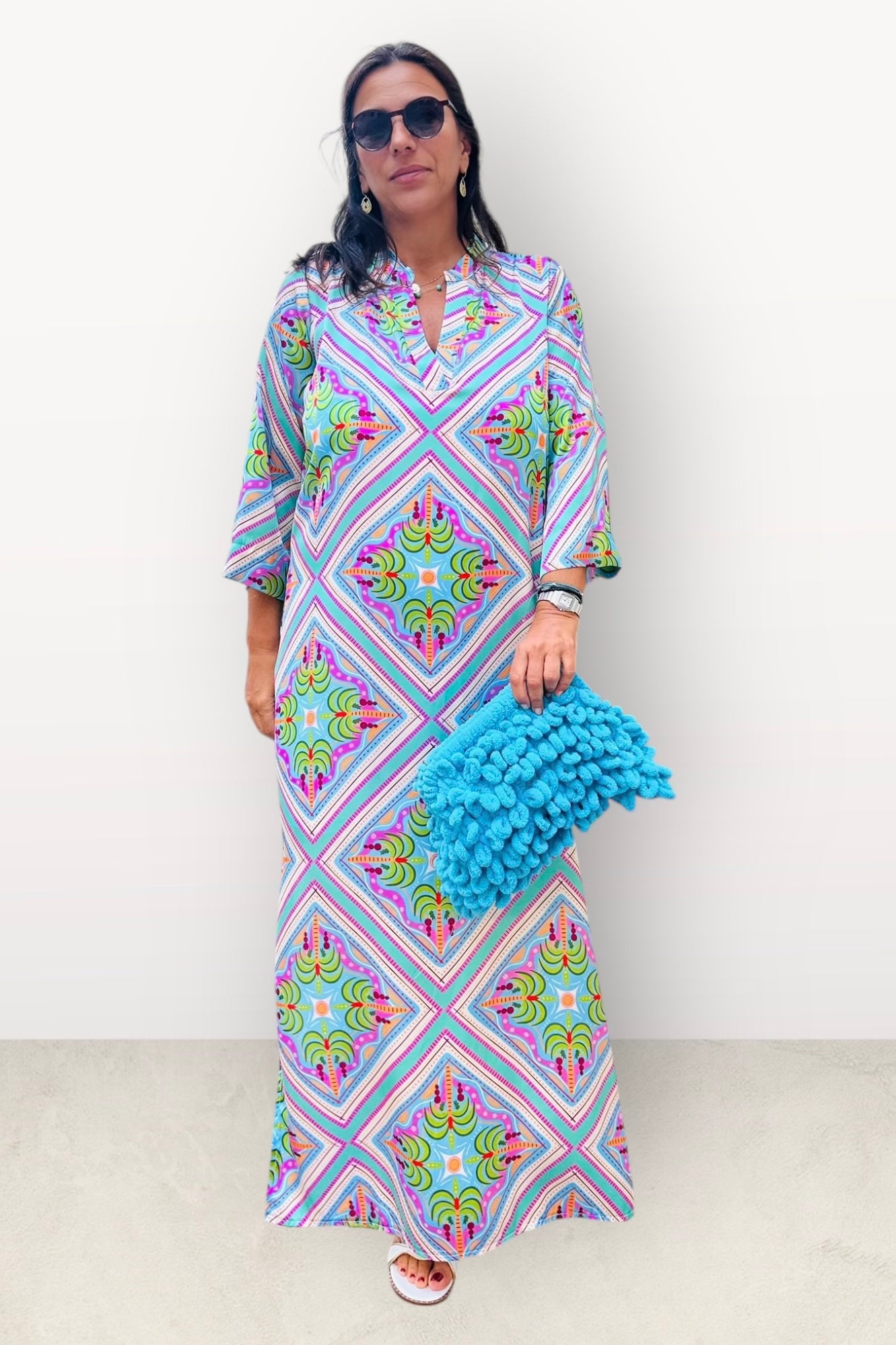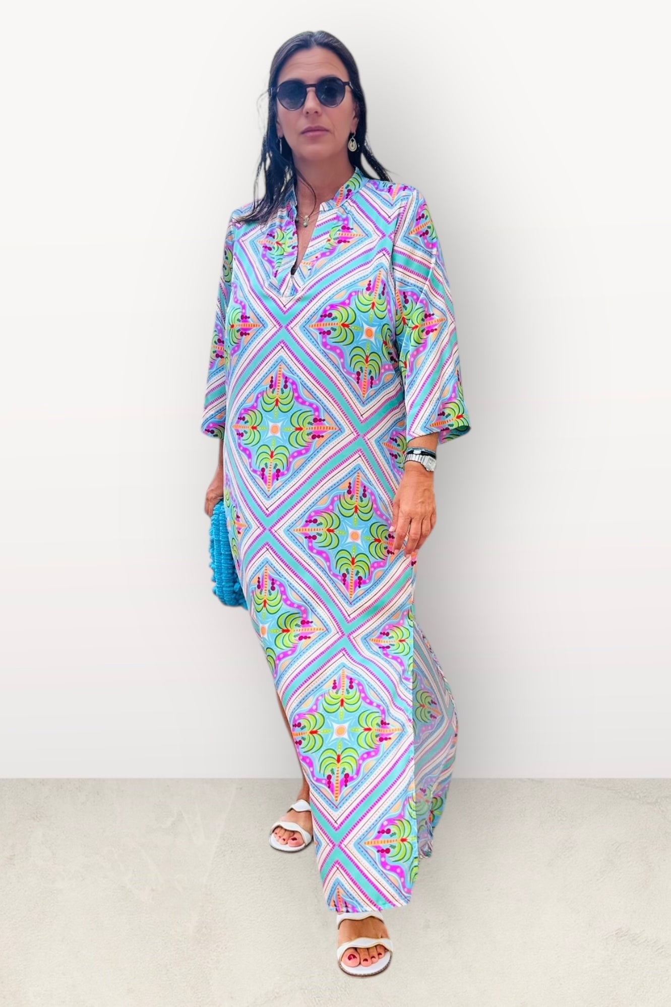 Αναδείξτε τη φυσική σας κομψότητα με αυτό το υπέροχο καφτάνι φόρεμα, ιδανικό για τις ζεστές ημέρες του καλοκαιριού αλλά και για κομψές αποδράσεις. Με χαλαρή γραμμή και αέρινη υφή, προσφέρει μοναδική άνεση χωρίς να θυσιάζει το στυλ. Φοριέται εύκολα από το πρωί ως το βράδυ – στην παραλία, στο νησί ή στην πόλη. Συνδυάστε το με σανδάλια και διακριτικά κοσμήματα για ένα αβίαστα κομψό αποτέλεσμα.