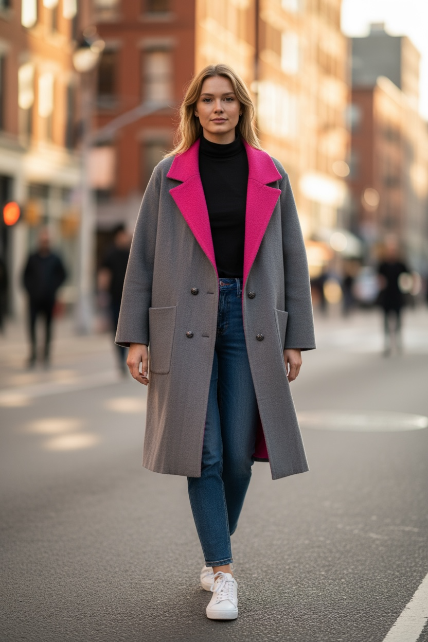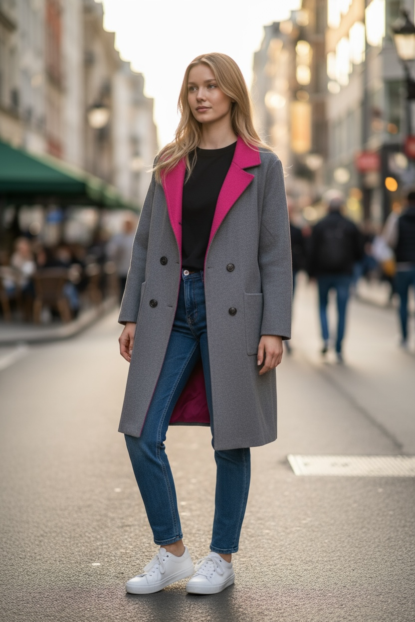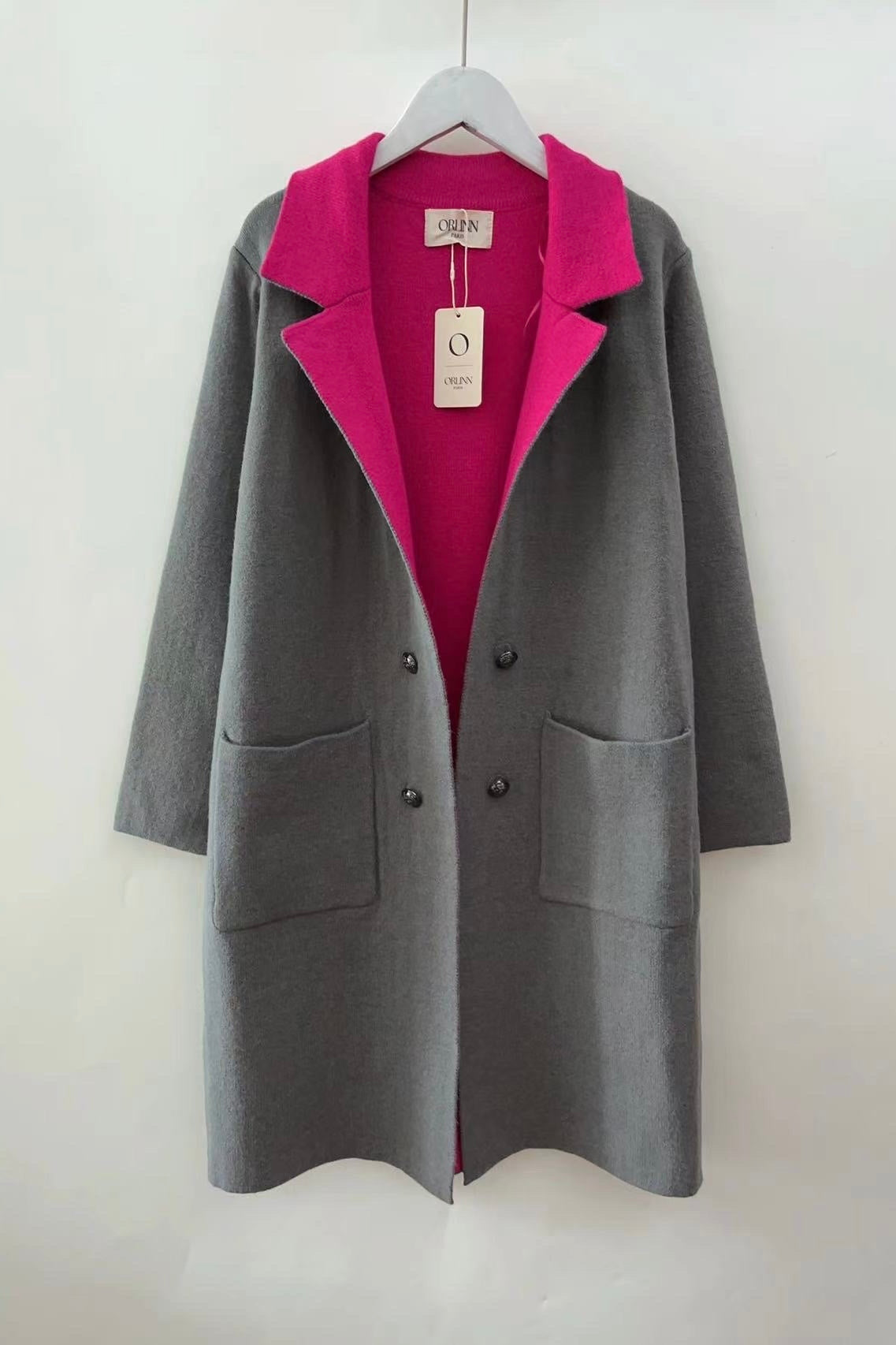 Orlinn - Ζακέτα Midi με Διπλή Απόχρωση στο Πέτο & Διακοσμητικά Χρυσά Κουμπιά Γκρι