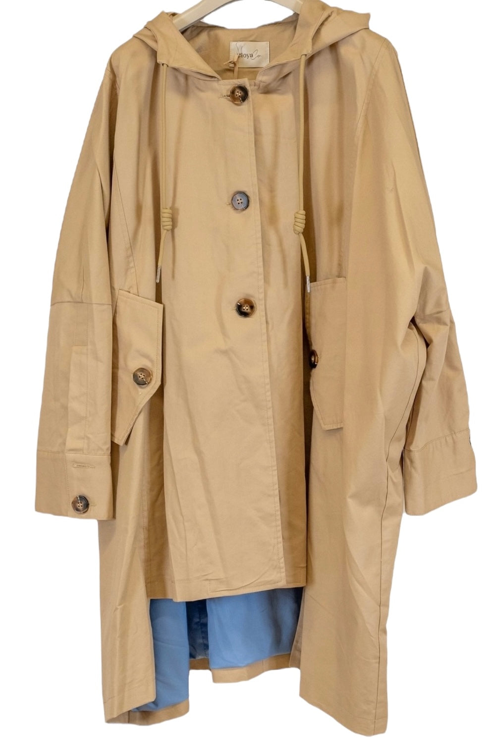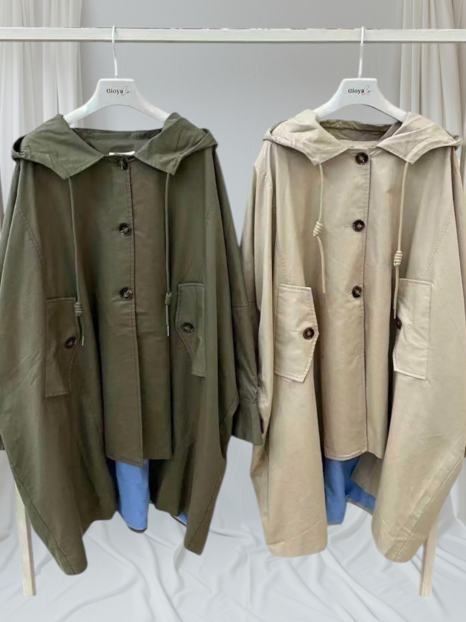 Αναβαθμίστε το στυλ σας με αυτή την κομψή oversize καμπαρντίνα, ιδανική για κάθε εποχή. Διαθέτει γιακά που καταλήγει σε κουκούλα, χοντρή μανσέτα στα μανίκια που χαρίζουν ιδιαίτερο χαρακτήρα. Το μπροστινό κλείσιμο με κοκάλινα κουμπιά προσφέρει μίνιμαλ και εκλεπτυσμένη εμφάνιση, ενώ οι flap τσέπες προσθέτουν πρακτικότητα. Στο πίσω μέρος είναι πιο μακριά ενώ στο μπροστινό μέρος έχει κόψιμο τετράγωνο πιο κοντό προσδίδοντας μια νότα στυλ παρκά. Μοναδική υφή καθώς είναι πολύ μαλακό ύφασμα και εντός έχει φόδρα από γαλάζιο ύφασμα πουκαμισού!
