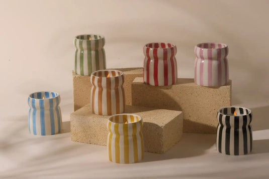 Μεταφερθείτε στις πιο όμορφες παραλίες του κόσμου με τη συλλογή Cabana, σχεδιασμένη για να γεμίζει τον χώρο σας με χαλαρωτικά, αναζωογονητικά αρώματα θαλάσσιων προορισμών. Τα δοχεία της συλλογής είναι εμπνευσμένα από ριγέ ομπρέλες, έχουν τέλειο μέγεθος και είναι ζωγραφισμένα στο χέρι. Αφού τελειώσει το κερί, το ασφαλές για τρόφιμα κεραμικό δοχείο μπορεί να επαναχρησιμοποιηθεί για τις δικές σας γαστρονομικές δημιουργίες ή ως ένα γουστόζικο διακοσμητικό κομμάτι! Κερί από 100% σόγια και βαμβακερό φυτίλι, σε κεραμική συσκευασία. Νότες κορυφής: Πρωινή δροσιά, ξύσμα μανταρινιού, φύλλα λεμονιού Meyer. Μεσαίες νότες: φράουλα, μέντα, πεπόνι Honeydew. Νότες βάσης: Ζάχαρη, γεράνι, σαφράν. Η διάρκεια και η ένταση αρώματος αντιστοιχούν σε 36+ ώρες ορθής καύσης.