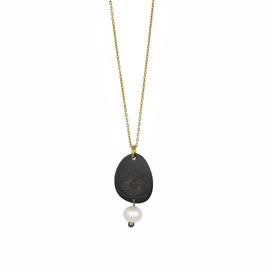 Pavlina Verouki Classic Eyes - Ασημένιο Κολιέ Μεγάλο Βότσαλο Μάτι κ Μαργαριτάρι Μαύρο Ρόδιο
