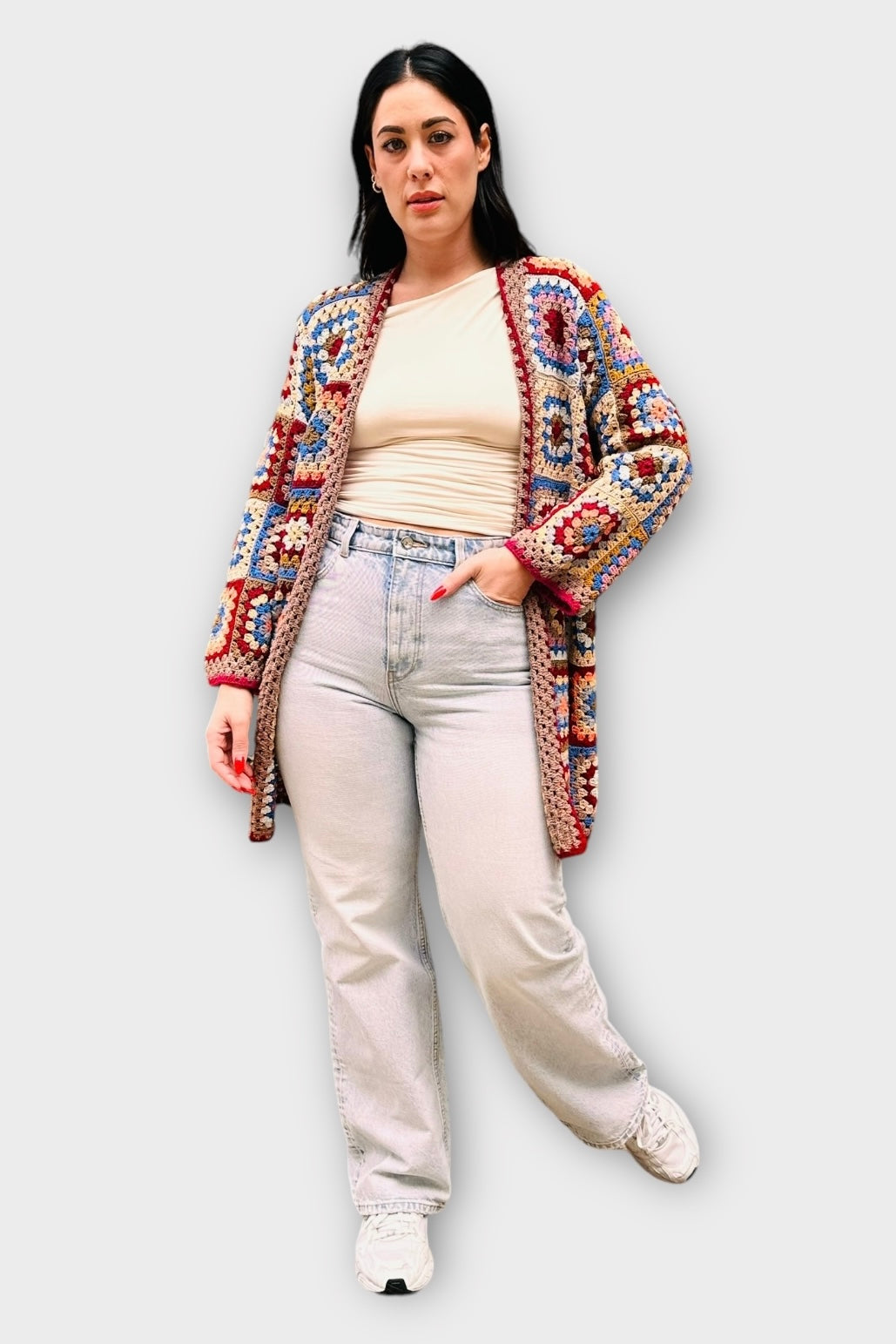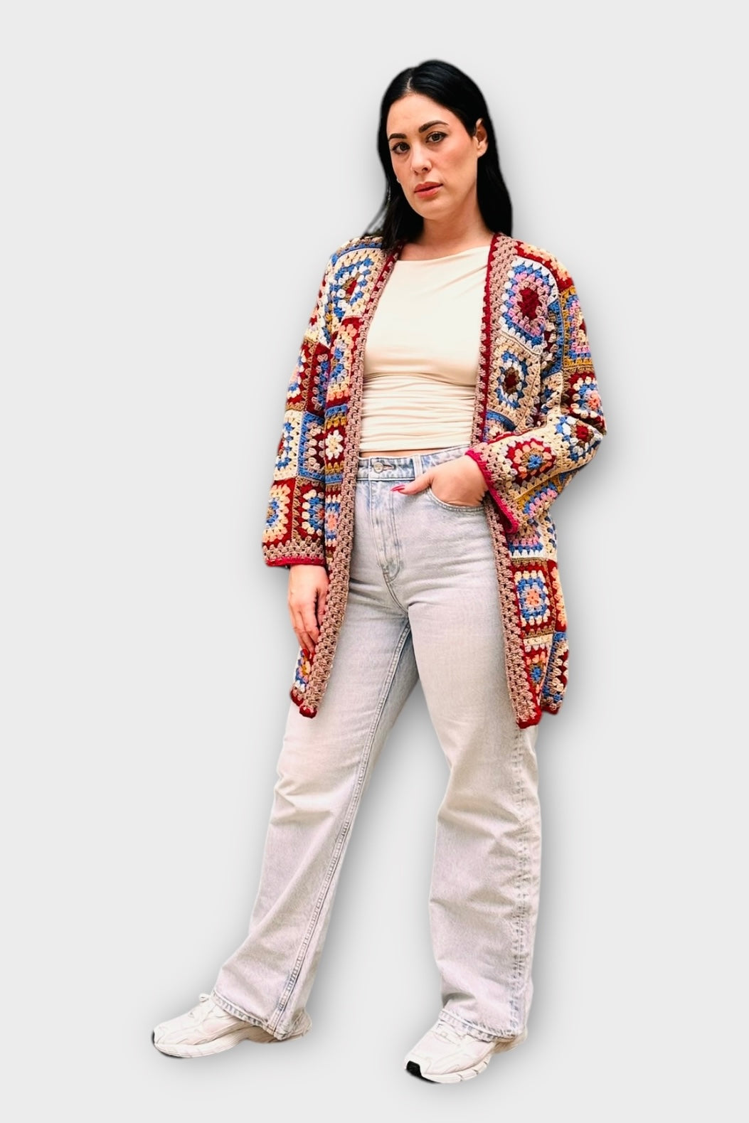 Πλεκτή ζακέτα σε boho στυλ, φτιαγμένη με την παραδοσιακή τεχνική του "Granny Square". Διαθέτει έντονα χρώματα σε γήινες και παστέλ αποχρώσεις, όπως μπορντό, μπεζ, μπλε κροκί, ροζ και γκρι, που συνδυάζονται αρμονικά για να δημιουργήσουν ένα μοναδικό και εντυπωσιακό αποτέλεσμα. Το σχέδιο αποτελείται από γεωμετρικά τετράγωνα που συνθέτουν ένα πολυδιάστατο και retro look.