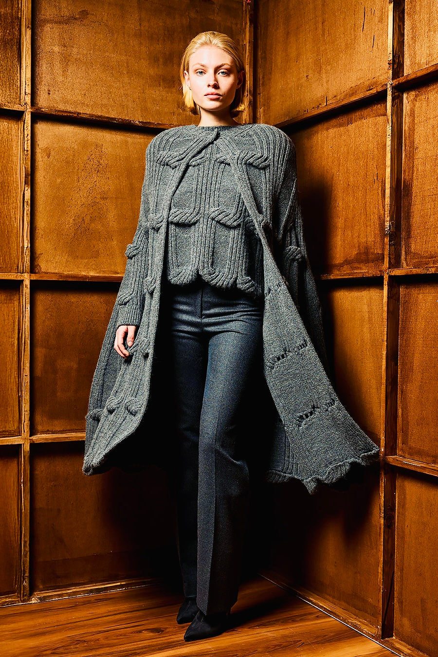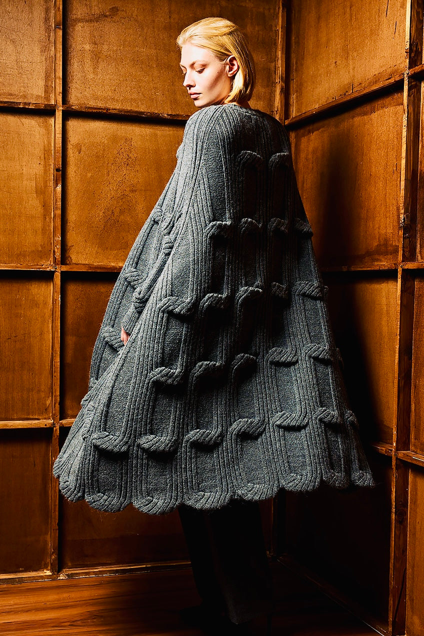 Πλούσια πλέξη με ιδιαίτερα relief στοιχεία (κόμβους / ραφές / knotted λεπτομέρειες) που δίνουν βάθος και υφή – κάθε σου κίνηση αναδεικνύει τη μοναδικότητά της.