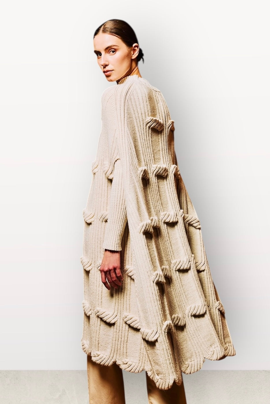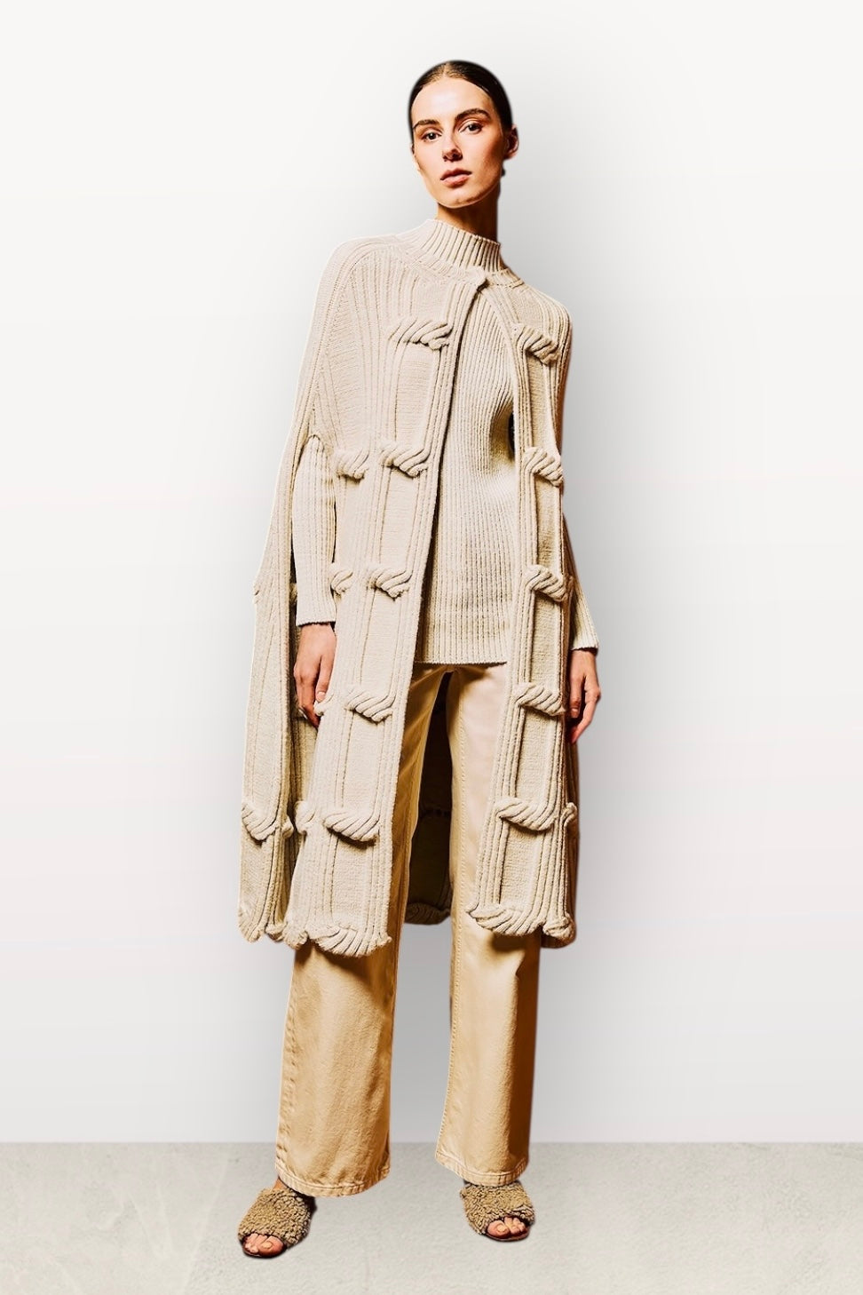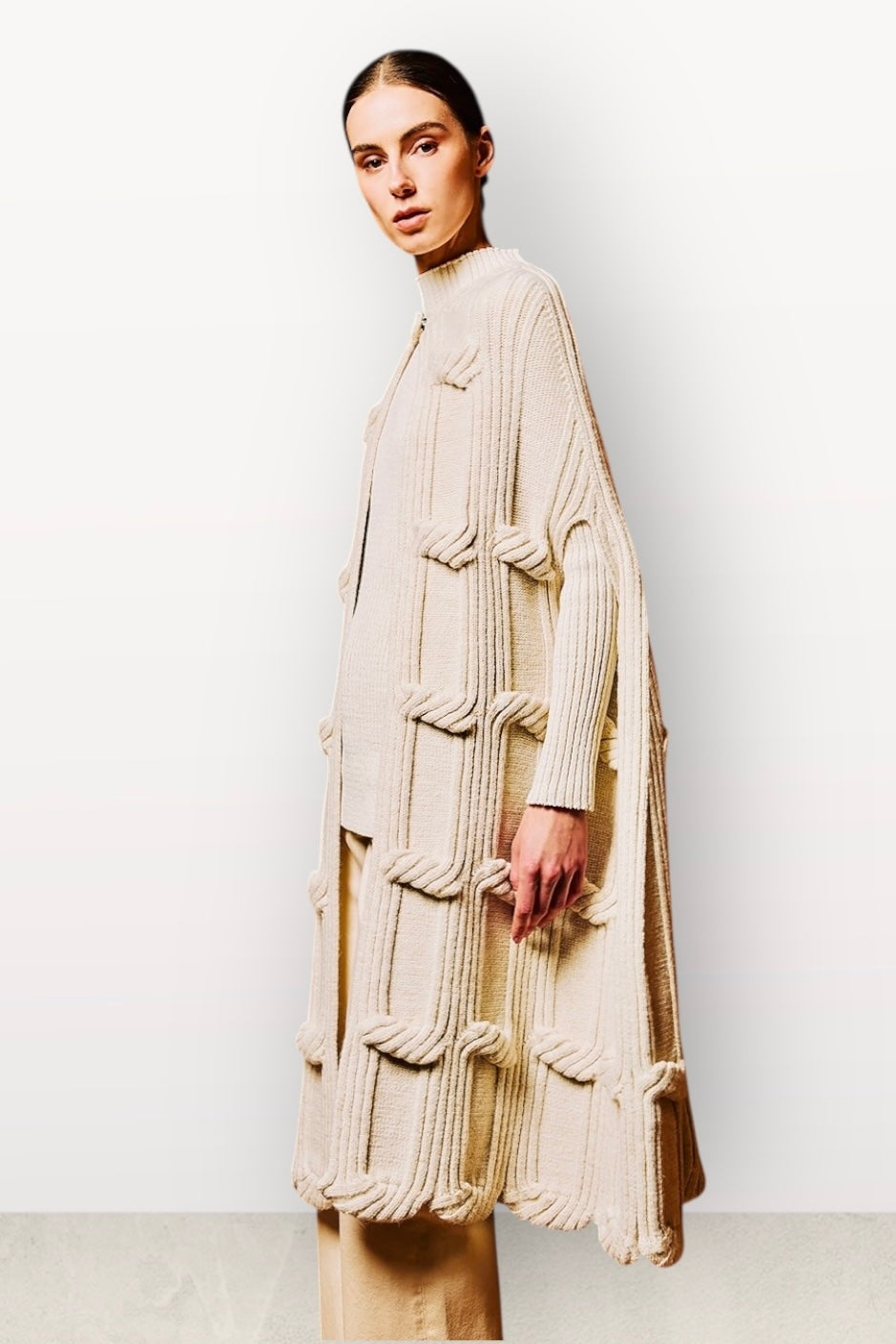 Tailor Made - Μακριά Kάπα Πλεκτή Premium Απαλή Υφή & Art-Details Εκρού
