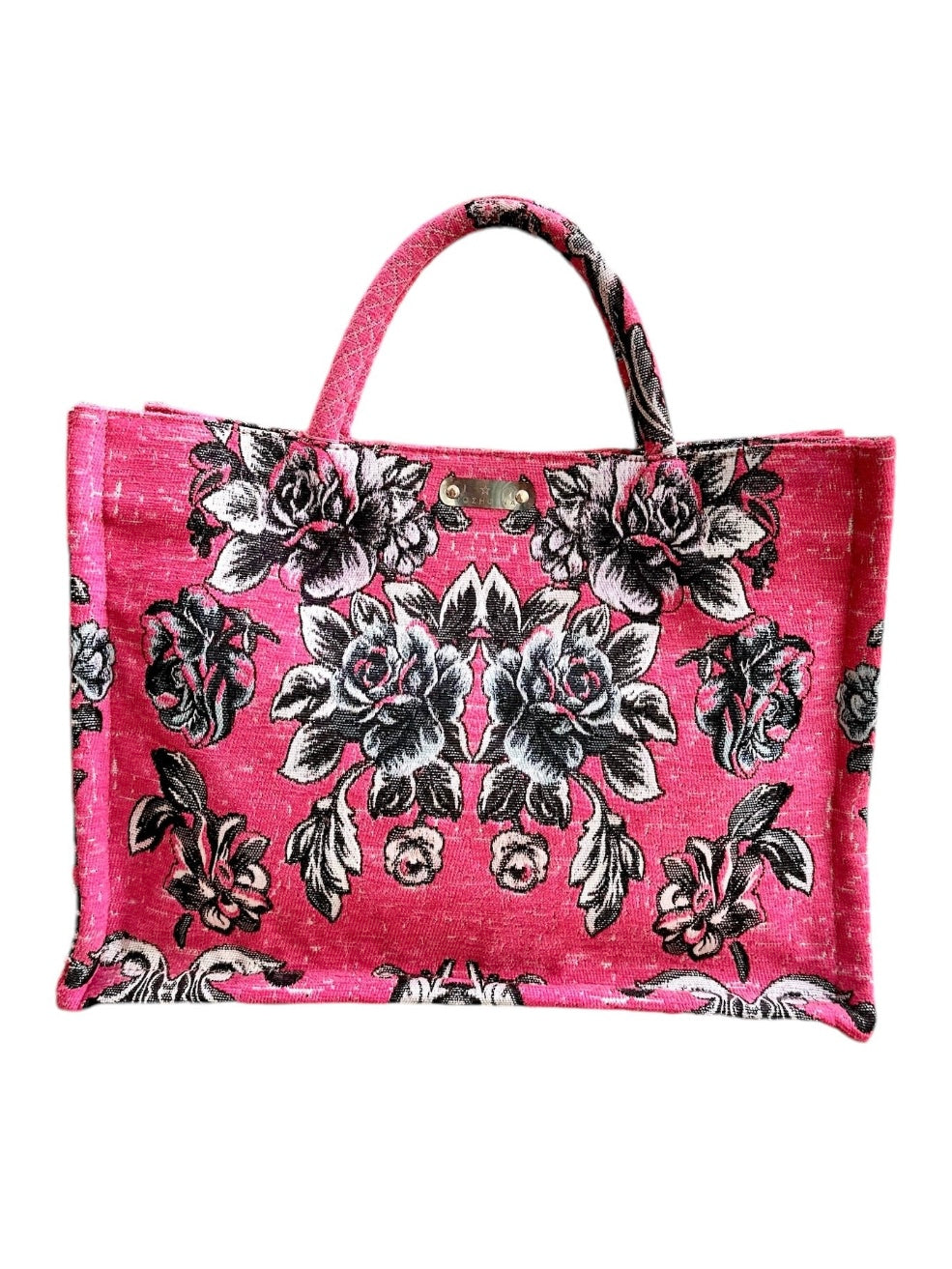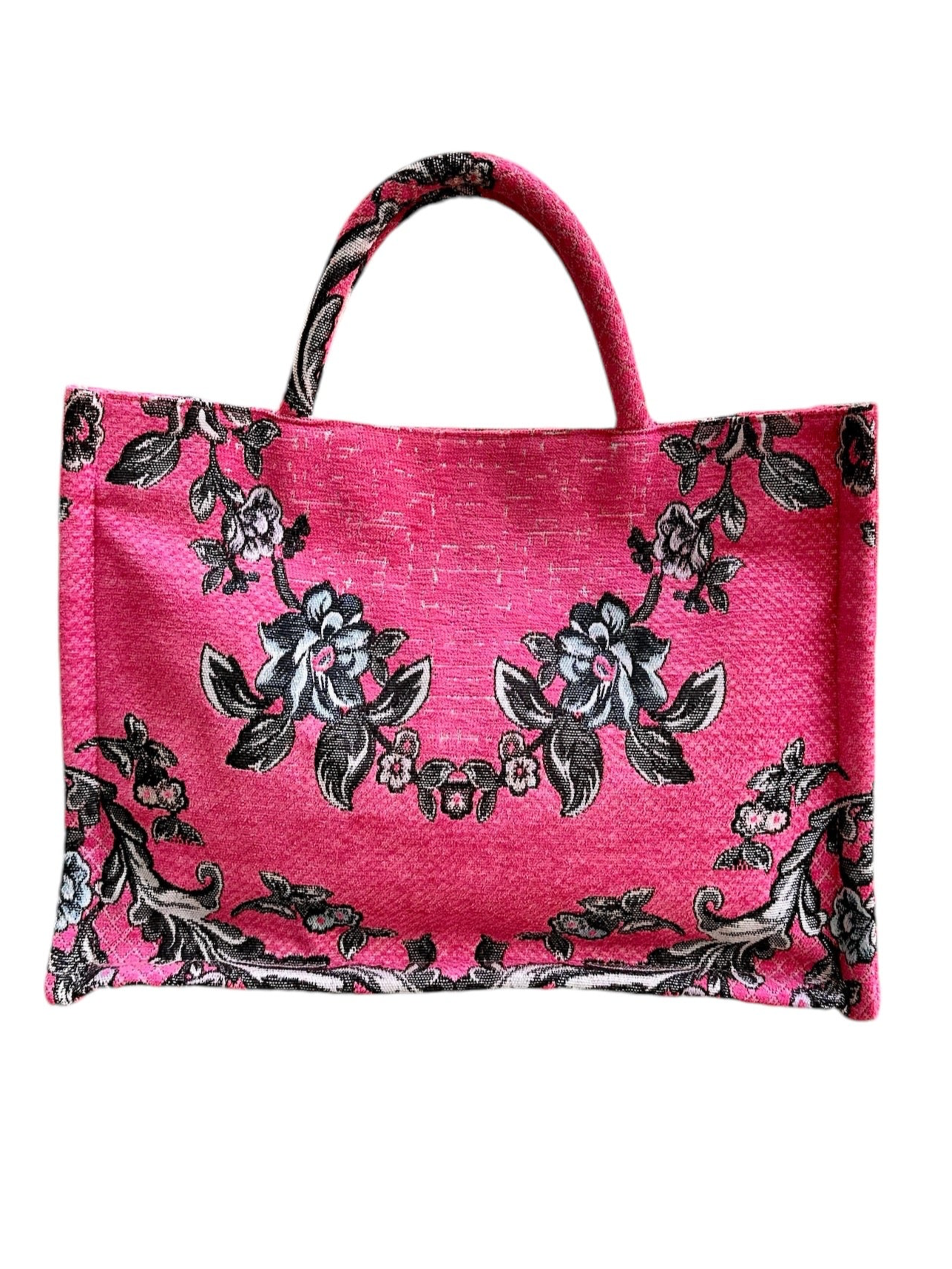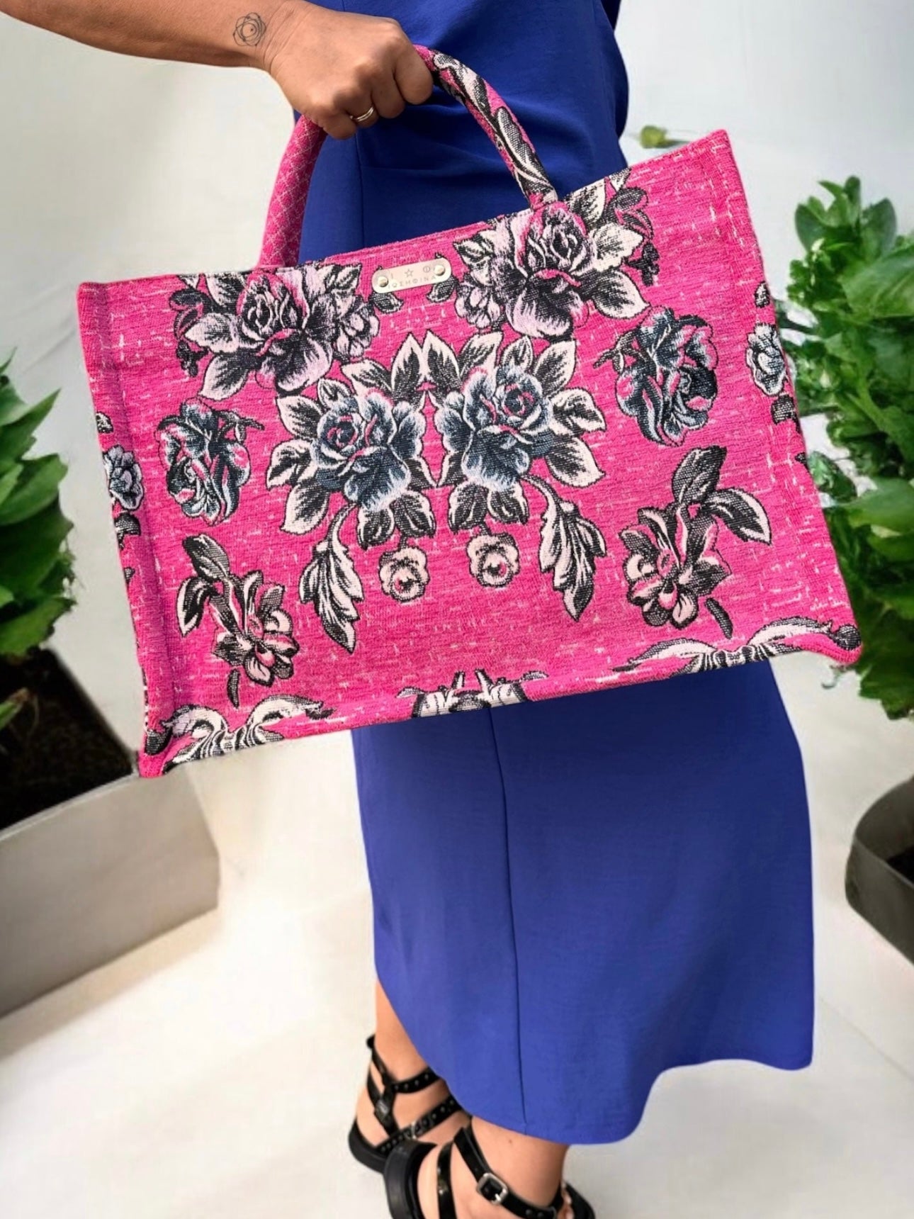 Τσάντα χειρός με εντυπωσιακό φλοράλ σχέδιο σε αποχρώσεις του μαύρου και του γκρι πάνω σε φούξια βάση. Το υλικό της είναι ανθεκτικό και ιδανικό για καθημερινή χρήση, ενώ οι ευρύχωρες διαστάσεις της την καθιστούν ιδανική για να χωρέσει όλα τα απαραίτητα. Διαθέτει πρακτικά χερούλια για άνετη μεταφορά και είναι εξαιρετική επιλογή για casual εμφανίσεις με στυλ.