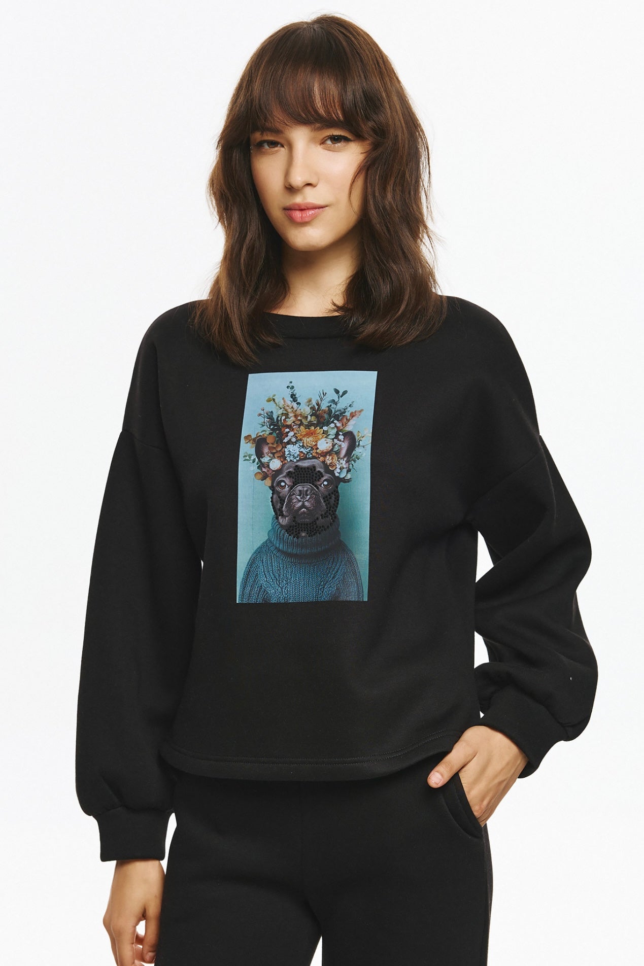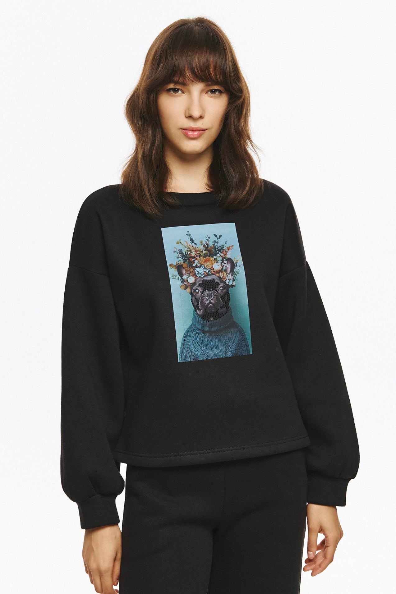 Φούτερ σε μαύρο χρώμα με fleece εσωτερικά, με φουσκωτά μανίκια, φαρδιά γραμμή oversized & στρογγυλή λαιμόκοψη. Είναι cropped ίσια γραμμή Στην μπροστινή πλευρά έχει στάμπα με σχέδιο Γαλλικό Μπουλντόγκ, με λουλούδια στο κεφάλι και πουλόβερ. Η στάμπα έχει λεπτομέρειες με μαύρες πούλιες στο πρόσωπο του σκύλου. Δημιουργώντας ένα παιχνιδιάρικο Look! Ιδανικό για casual και άνετα looks.