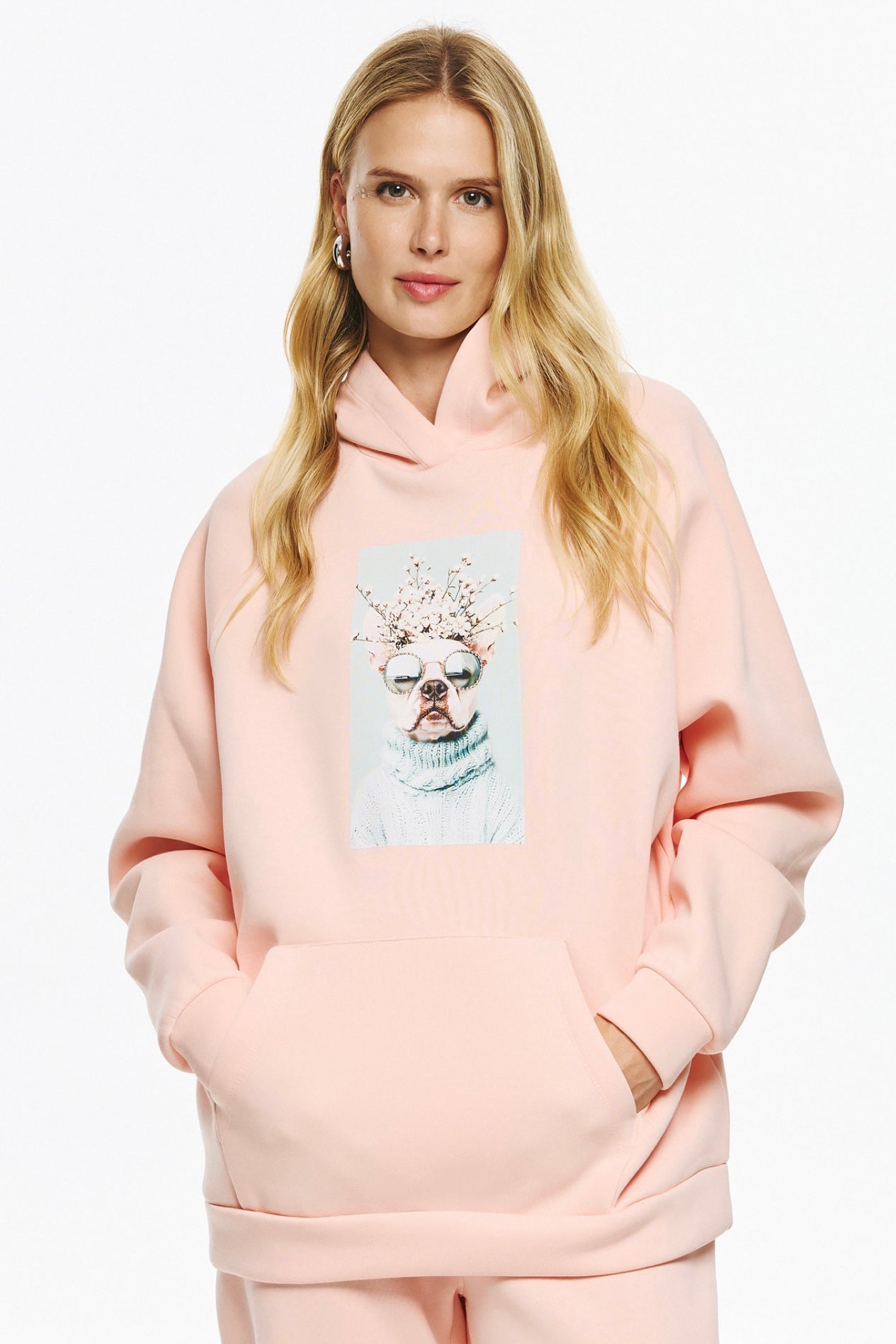Unitee- Φούτερ Μπλούζα Ροζ με Κουκούλα με Γαλλικό Μπουλντόγκ