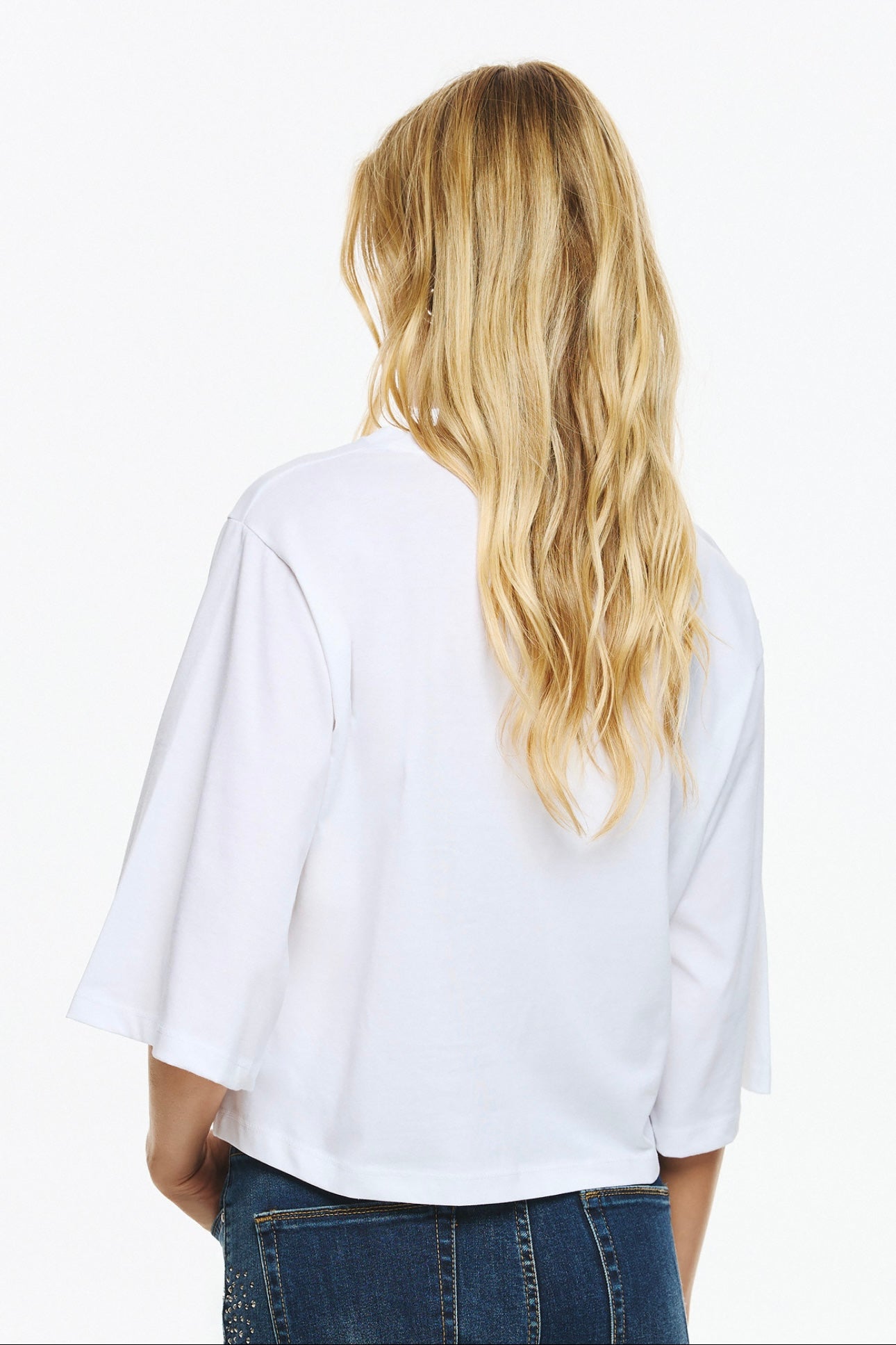 Λευκό T- shirt με στρογγυλή λαιμόκοψη, φαρδύ μανίκι 3/4 καμπάνα και cropped γραμμή. Στο κέντρο έχει τύπωμα μια φιγούρα Quenn of Hearts κρατώντας μια καρδιά με στρας κόκκινα. Δημιουργώντας ένα παιχνιδιάρικο Look! Ιδανικό για casual αλλά και εξεζητημένα looks.